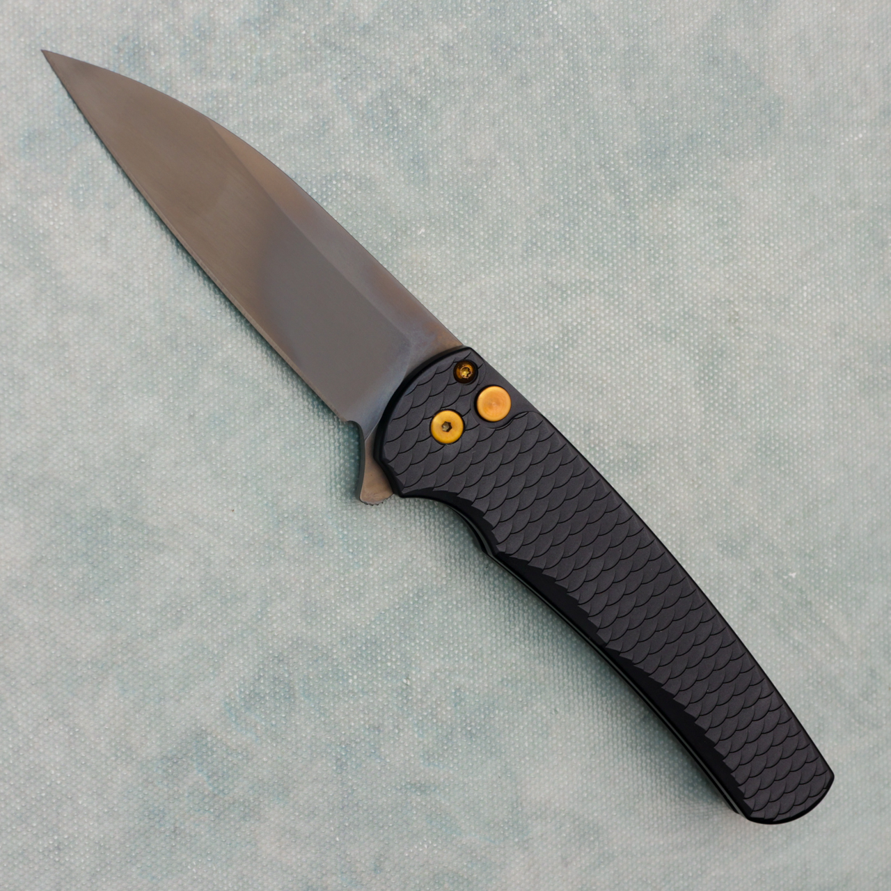 This model features Dargonscale black anodized 7075 aluminum handle scales. Smoky grey DLC finished CPM-MagnaCut stainless steel wharncliffe blade. Rose gold finished hardware and DLC pocket clip for tip up carry. These function as they should, but have cosmetic blemishes in the blade finish. The blemish is not available for warranty on the cosmetic blemish. They are marked with XX on back of the blade to identify that they are blems. Brand new in box.