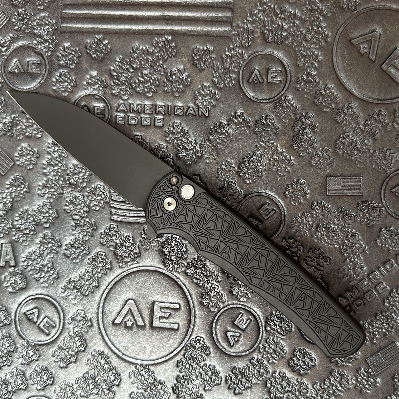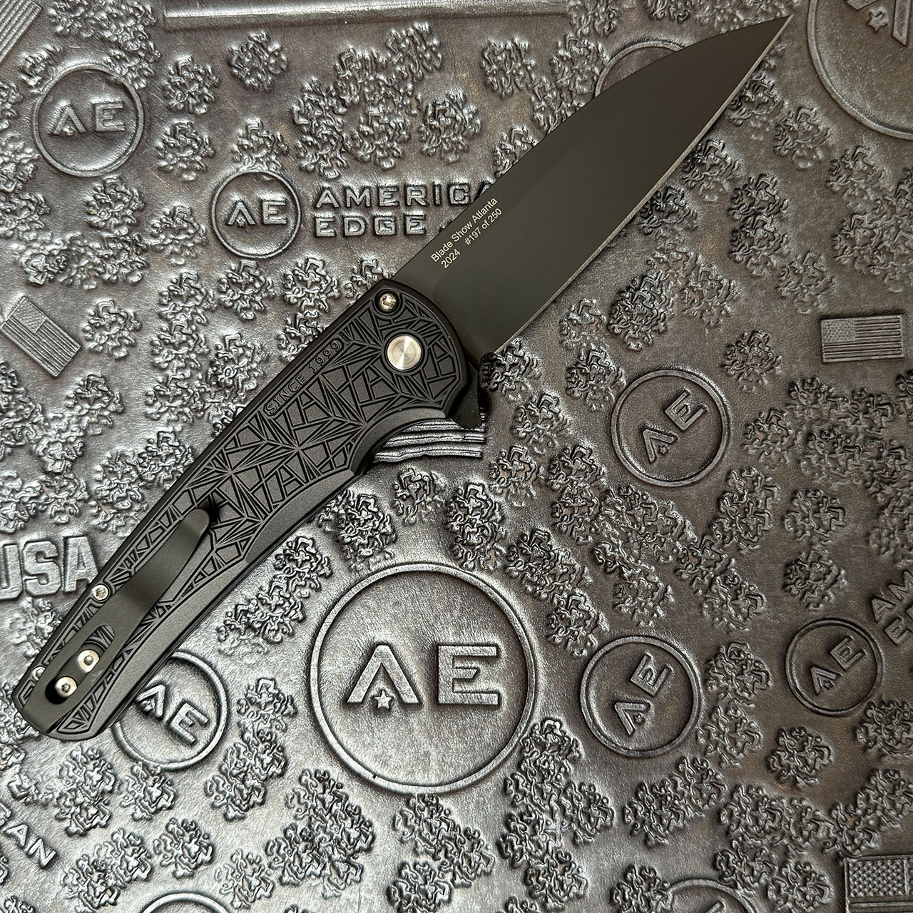 This 2024 Blade Show Atlanta limited edition model features nexus/since 1999 textured black 7075 aluminum handle scales. Black DLC finished CPM-MagnaCut wharncliffe blade. Black DLC finished hardware and pocket clip for tip up carry. Genuine pearl inlaid button. Limited edition serial number "xxx of 250" for Blade Show 2024. Brand new in box.