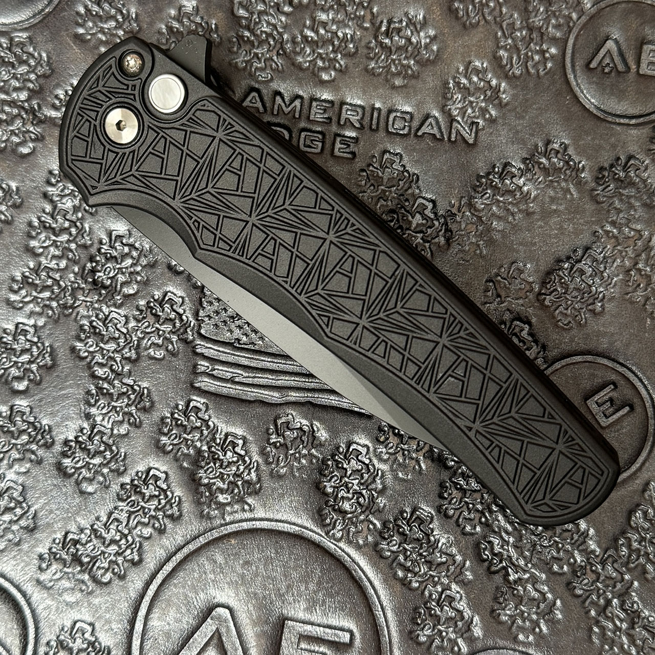 Pro-Tech Malibu Button Lock Flipper Wharncliffe Blade Show 2024 Nexus/Since 1999 Textured Black Handle DLC Magnacut Blade Pearl Button