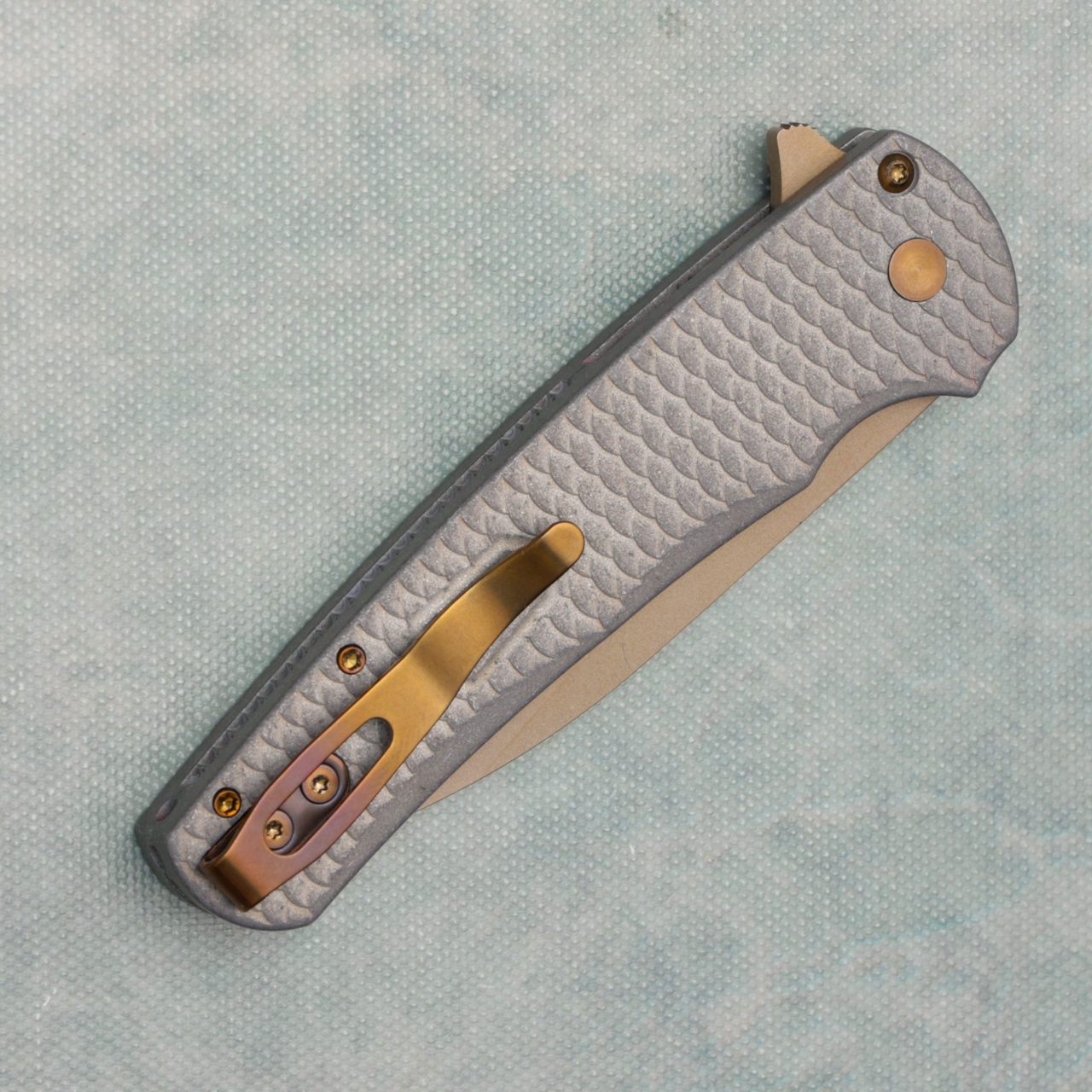 This AE Custom Shop model features blasted and tumbled dragon scale pattern 7075 aluminum handle scales. Bronzed finished CPM-MagnaCut stainless steel wharncliffe blade. Bronzed hardware and pocket clip for tip up carry. Pearl Button. Warranty void due to modifications. Brand new in box for a CCKSF25.MALIBU.1.