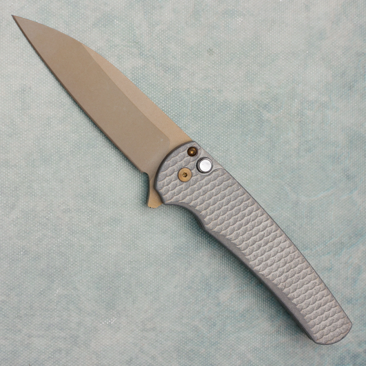 Pro-Tech Malibu Button Lock Flipper Wharncliffe Blasted/Tumbled Dragon Scale Handle Bronzed MagnaCut Blade AE CUSTOM SHOP