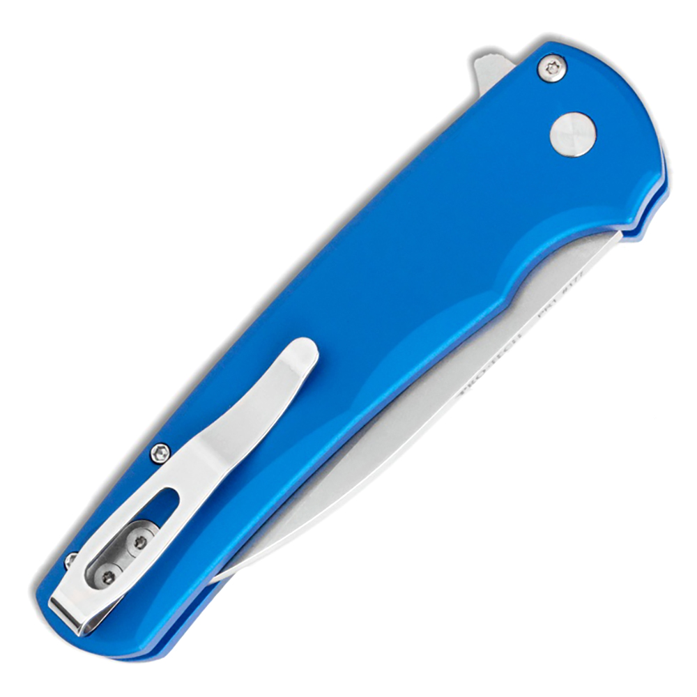 This model features solid blue anodized 7075 aluminum handle scales. Stonewash finished CPM-20CV stainless steel wharncliffe blade. Satin finished hardware and polished pocket clip for tip up carry. Brand new in box.