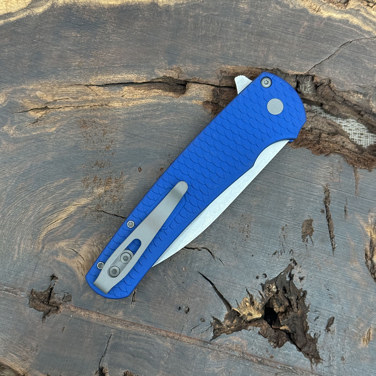 This model features Dragonscale blue anodized 7075 aluminum handle scales, a stonewash finished CPM-MagnaCut stainless steel wharncliffe blade, and blasted hardware and pocket clip for tip up carry. Brand new in box.