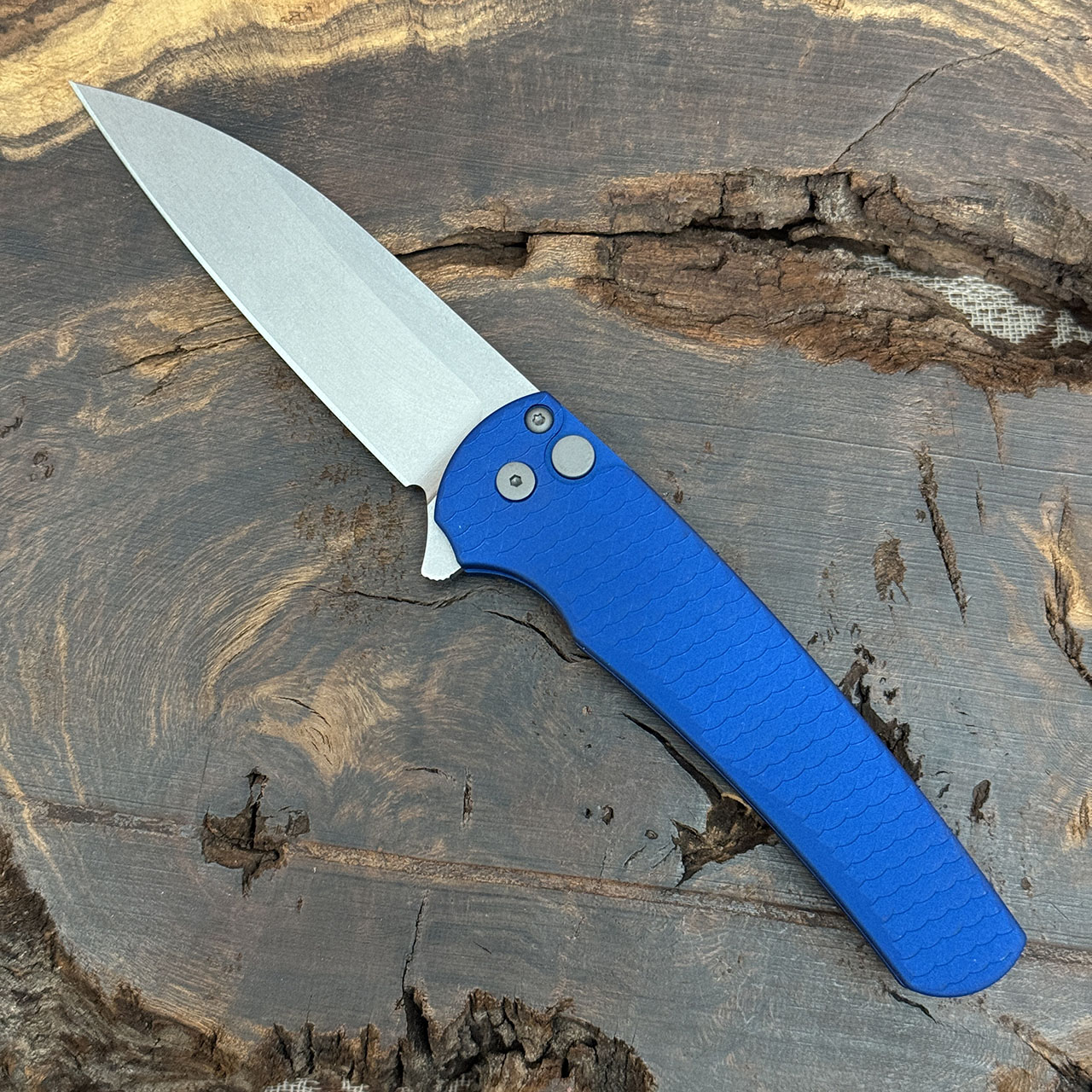 Pro-Tech Malibu Button Lock Flipper Wharncliffe Dragonscale Blue Handle Stonewash Magnacut Blade 5335-BLUE