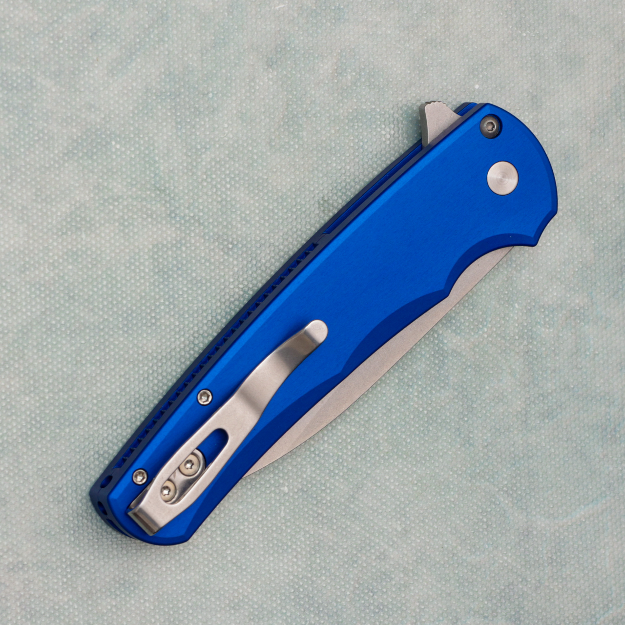 This model features solid blue anodized 7075 aluminum handle scales. Stonewash finished CPM-MagnaCut stainless steel wharncliffe blade. Satin finished hardware and polished pocket clip for tip up carry. Like new in box.