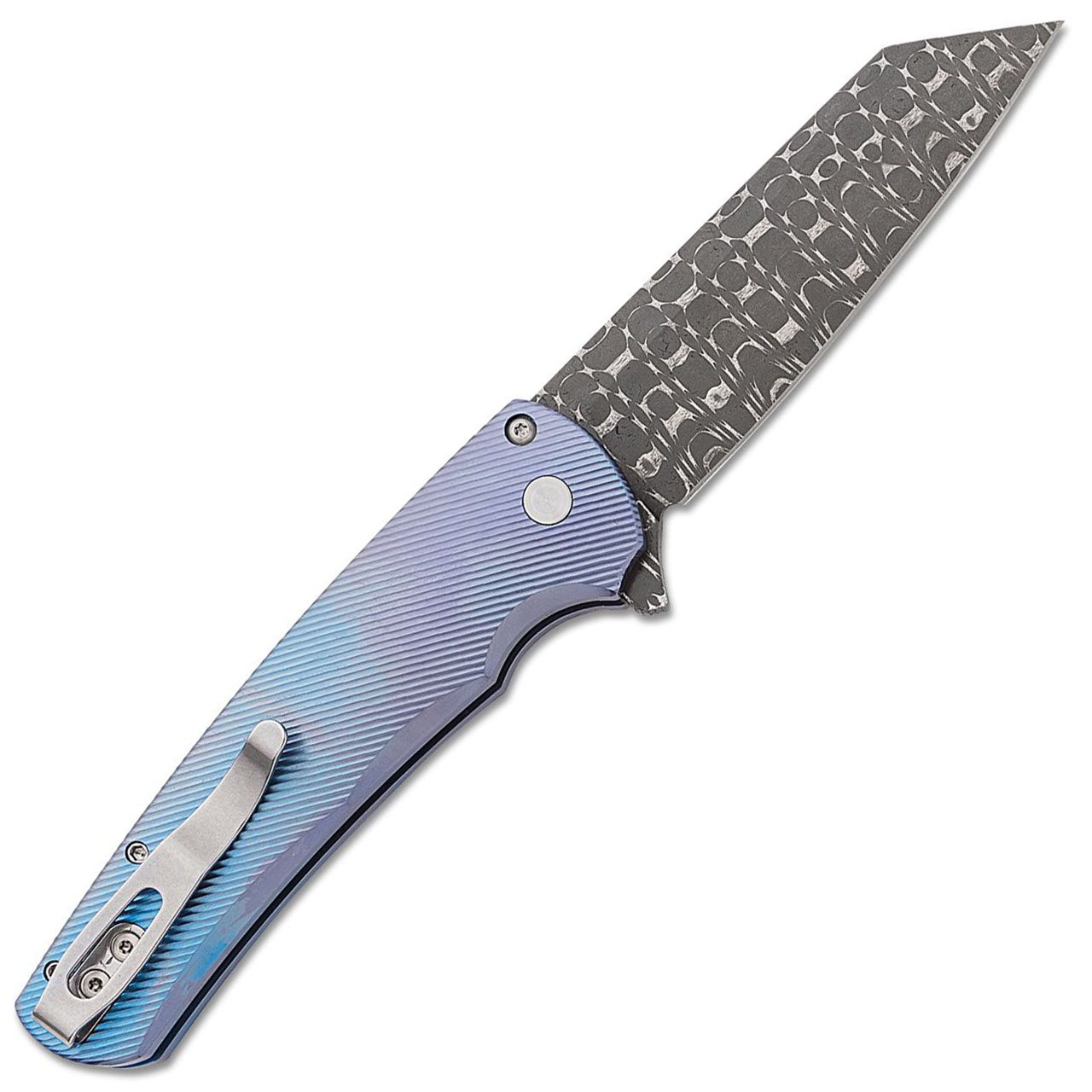 This titanium custom model features 3D machine textured blue titanium handle scales. Vegas Forge razorwire pattern damascus reverse tanto blade. Satin finished hardware and polished pocket clip. Genuine Mother of pearl Lip button. Bronze back spacer. Brand new in box.