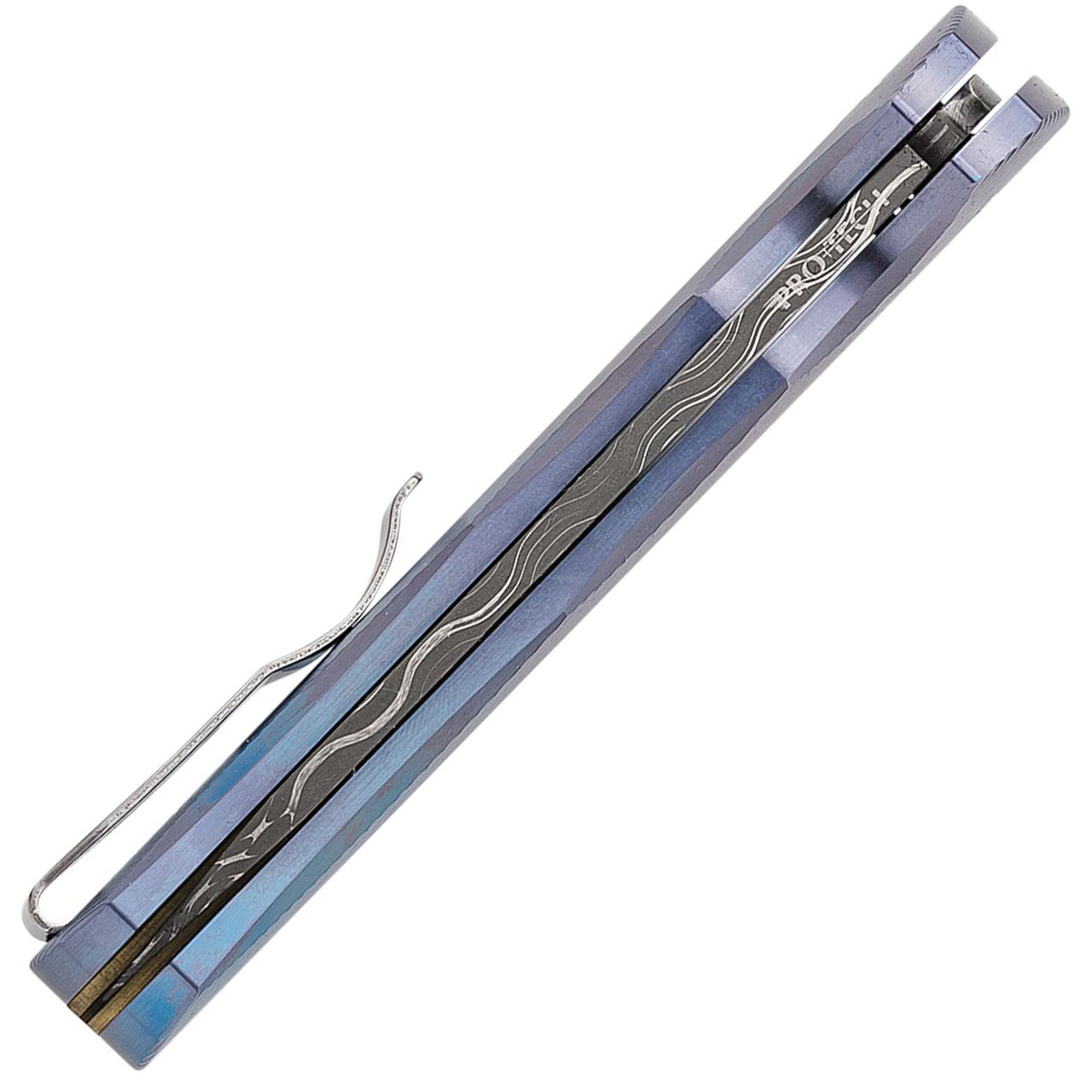 Pro-Tech Malibu Custom Button Lock Flipper Reverse Tanto 3D Machined Blue Titanium Handle Vegas Forge Razorwire Damascus Blade Pearl Button 2023.008