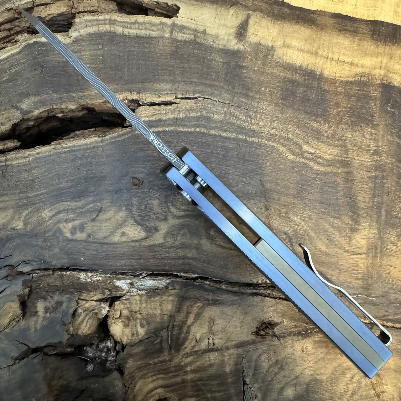 This titanium custom model features 3D machine textured blue titanium handle scales. Vegas Forge vines & roses pattern damascus reverse tanto blade. Satin finished hardware and polished pocket clip. Genuine Mother of pearl Lip button. Bronze back spacer. Brand new in box.
