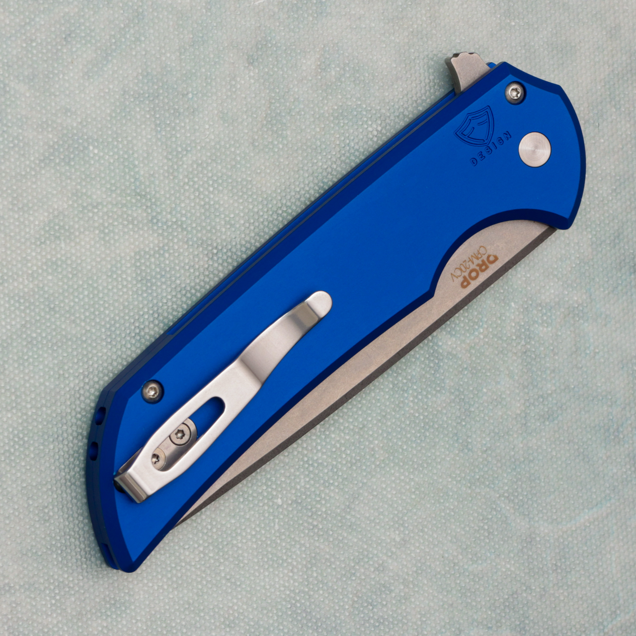 This model features solid blue anodized 7075 aluminum handle scales. Stonewash finished CPM-20CV stainless steel blade. Satin finished hardware and polished pocket clip for tip up carry. Like new in box.