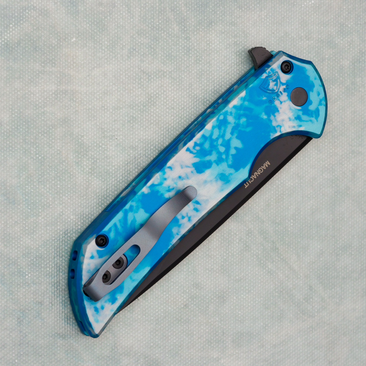This model features a frostbite anodized aluminum chassis with MOP push button. It features a black DLC Magnacut blade. Brand new in box.