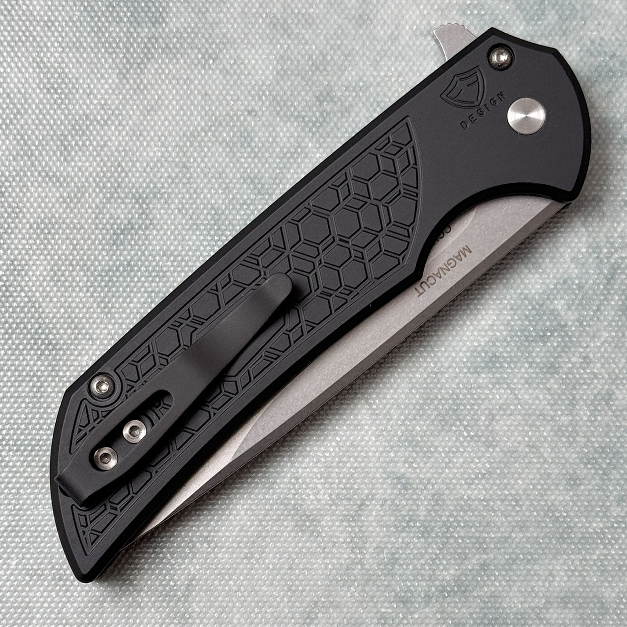 This model features gridlock textured black handle scales. Stonewash finished CPM-Magnacut stainless steel blade. Satin hardware, gold lip pearl button, and black pocket clip for tip up carry. Numbered xx of 40. Brand new in box.