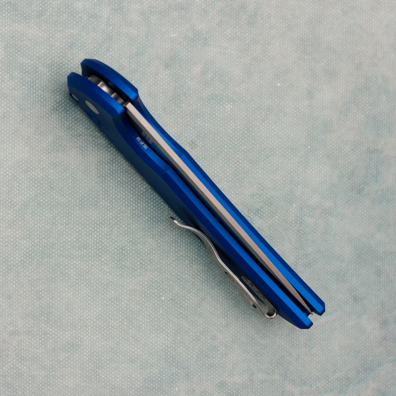This model features solid blue aluminum handle scales. It has a stonewash finished CPM-MagnaCut stainless steel blade and satin hardware and pocket clip for tip up carry. Mosaic button, and numbered 3 of 30. Very good condition in box.