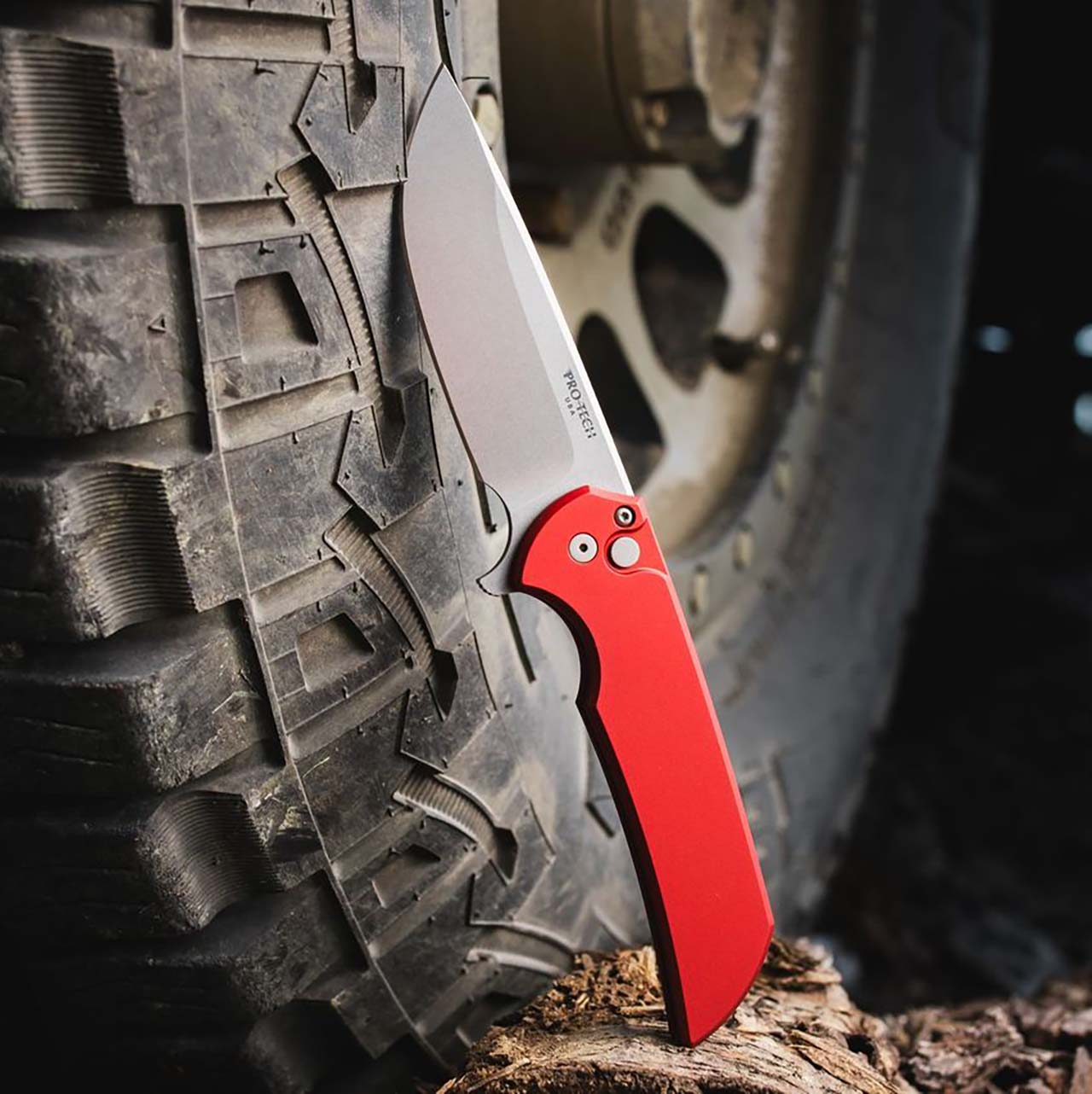 Pro-Tech Mordax Button Lock Flipper Solid Red Handle Stonewash 20CV Blade MX101-RED20CV
