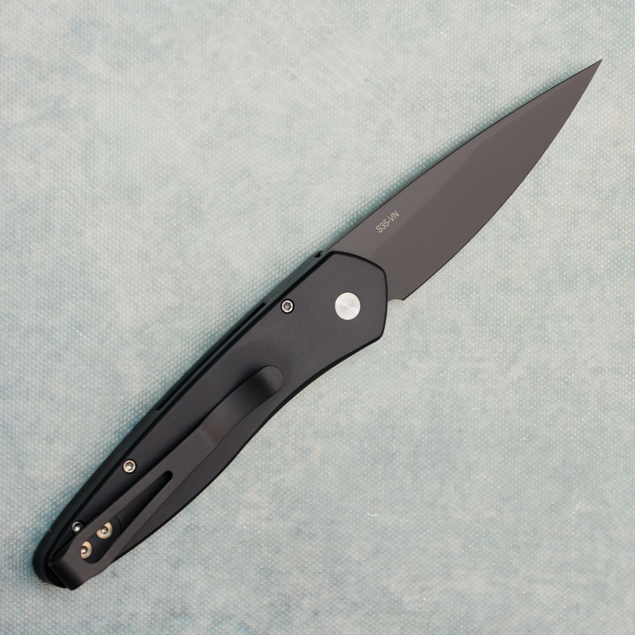 This model features solid black anodized 6061-T6 aluminum handle scales. Black DLC finished CPM-S35VN stainless steel spear point blade. Satin hardware and a black DLC tip-up deep carry pocket clip. Very good pre-owned condition, in box.