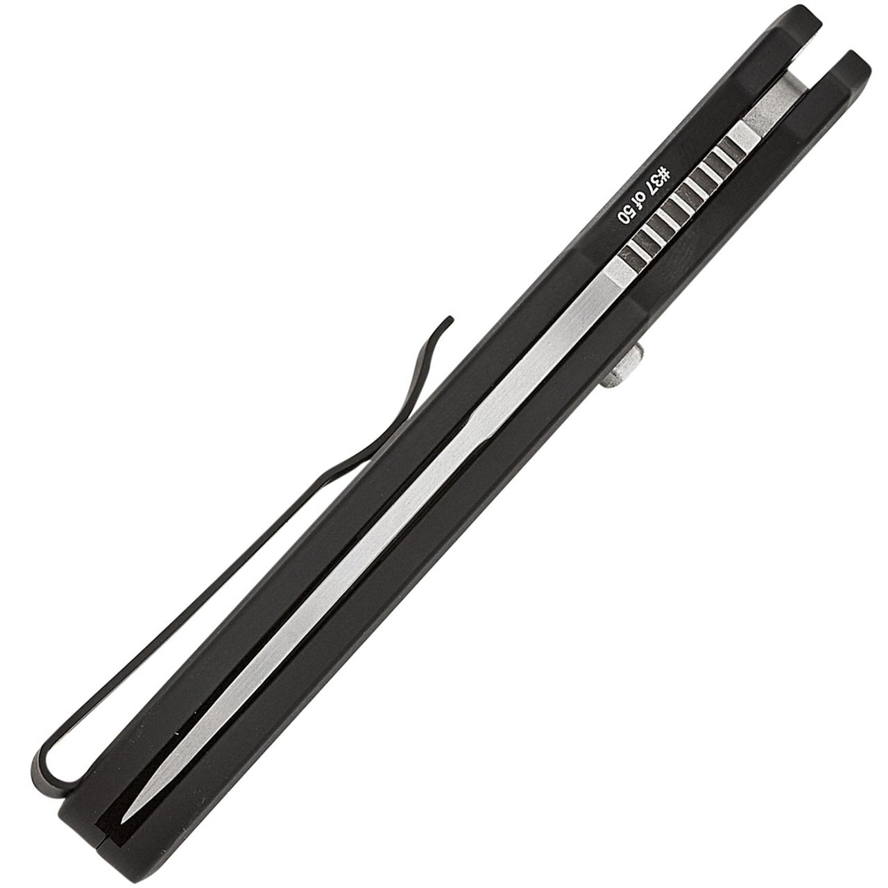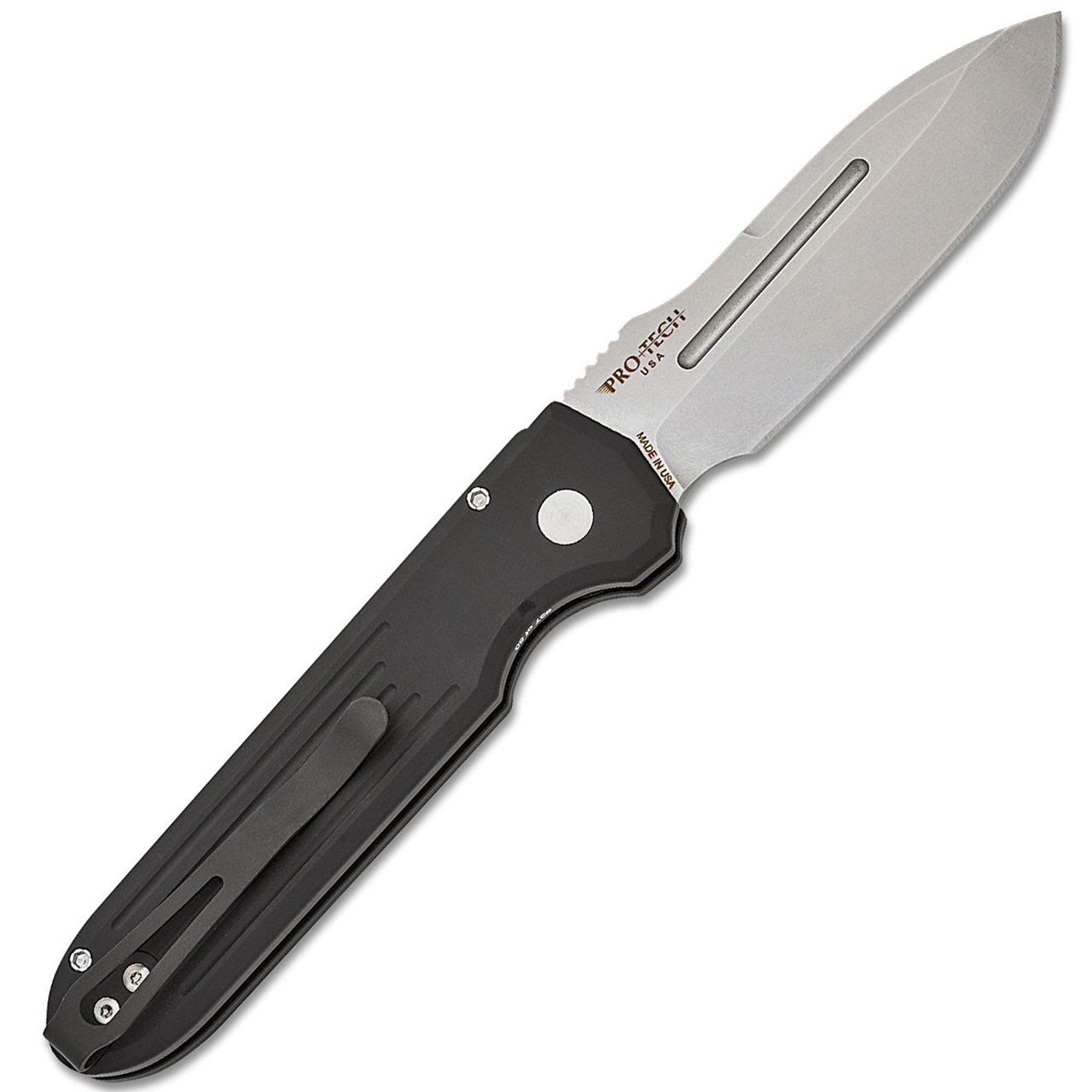 This model features black anodized 6061-T6 aluminum handle scales. Stonewash finished MagnaCut stainless steel spear point blade with a fuller on both sides and jimping on the spine. The blade is marked with the PDW logo and the ProTech logo. Satin finished hardware and black DLC finished pocket clip. Thumb slide button safety. Mosaic push button. Brand new in box.
