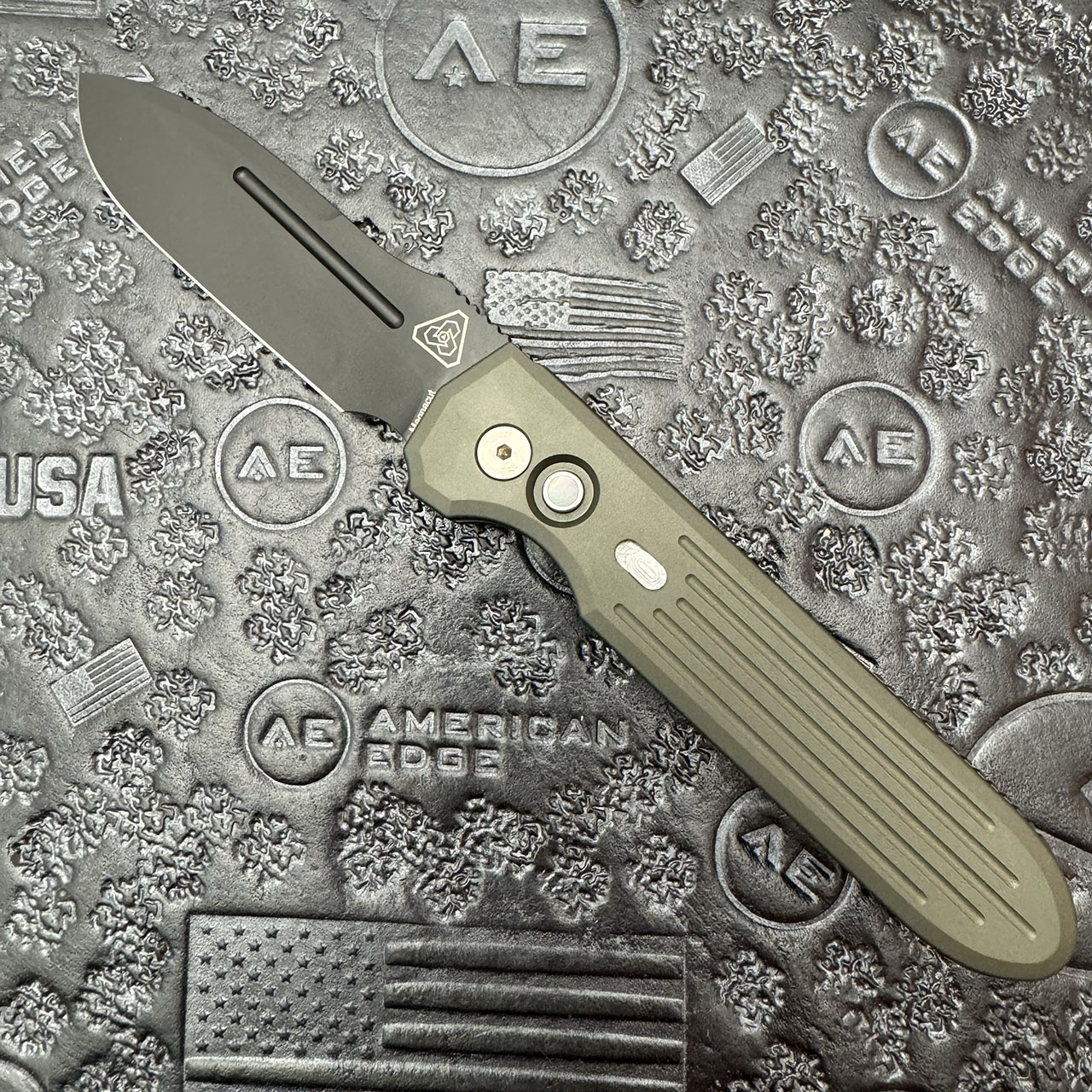This model features green anodized 6061-T6 aluminum handle scales. Black DLC finished MagnaCut stainless steel spear point blade with a fuller on both sides and jimping on the spine. The blade is marked with the PDW logo and the ProTech logo. Black DLC finished pocket clip. Thumb slide button safety. Black lip pearl push button. Brand new in box.