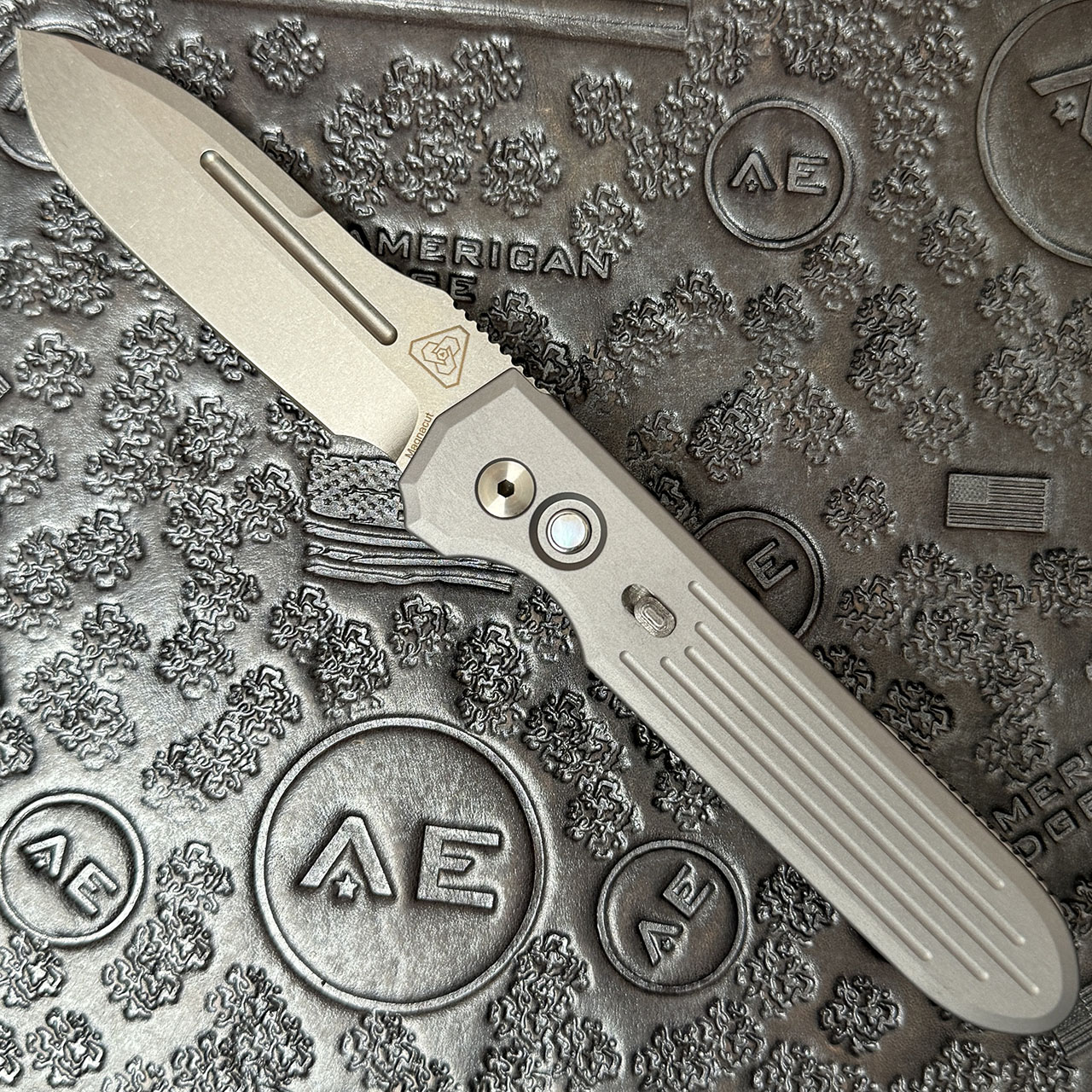 Pro-Tech PDW Invictus Auto Grey Handle Stonewash Blade Pearl Button Blade Show 2024