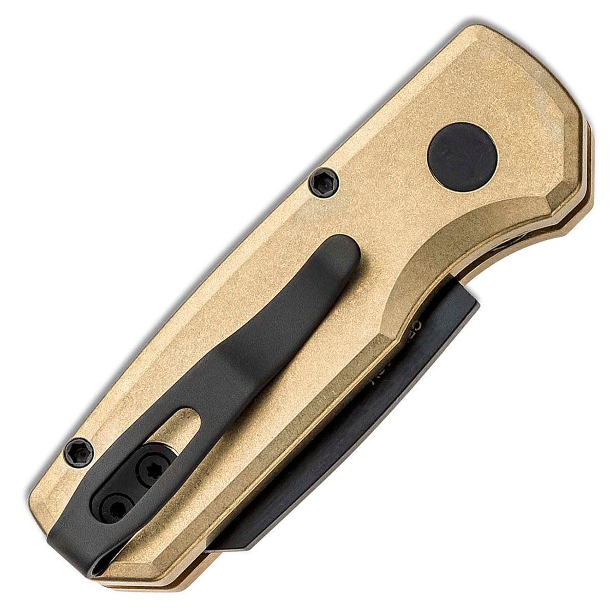 This limited model features stonewash finished Bronze AL handle scales. Black DLC finished CPM-20CV stainless steel reverse tanto blade. Black DLC finished hardware and pocket clip for tip up carry. Genuine mother of pearl inlaid push button. Brand new in box.