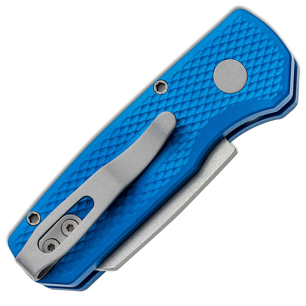 This model has a milled textured blue anodized 6061-T6 aluminum handle. Stonewash finished CPM-20CV stainless steel reverse tanto blade. Bead blast finished hardware and pocket clip for tip up carry. The blade is marked with the Pro-Tech logo and model information. Brand new in box.