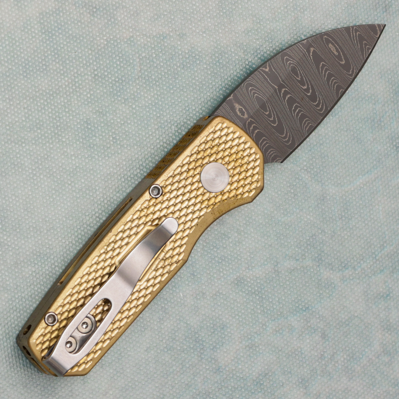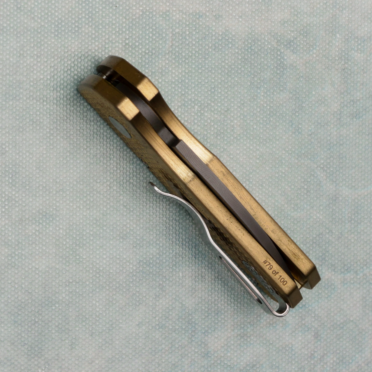 This limited Blade Show 2022 model features textured Bronze AL handle scales. Chad Nichols Ladder Damascus wharncliffe blade. Satin finished hardware and polished pocket clip for tip up carry. Mosaic push button. Numbered 79 of 100, has a little bit of patina on the handles, comes in box.