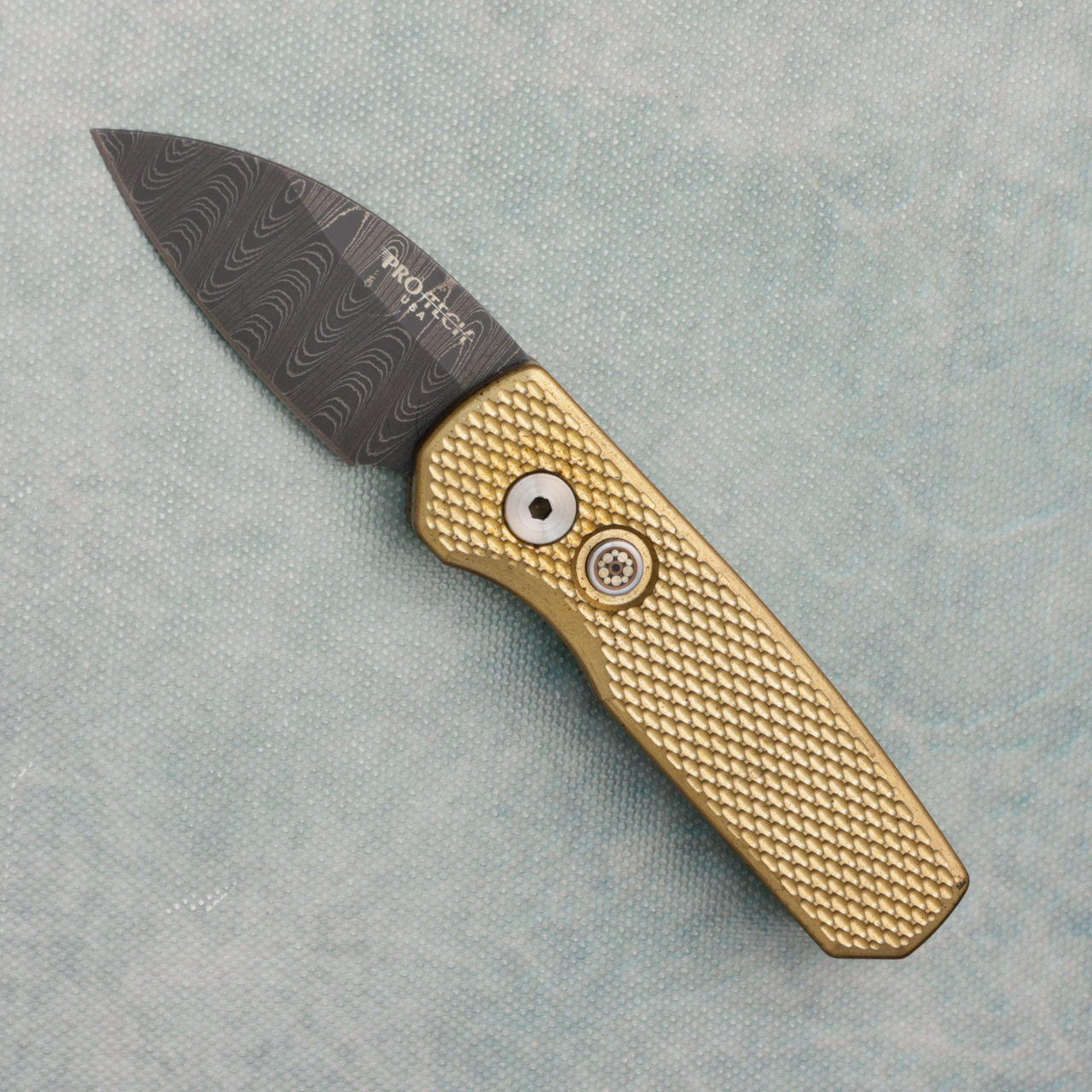 Pro-Tech Runt 5 Wharncliffe Bronze Textured AL Handle Damascus Blade Mosaic Button Limited Edition R5111-D (Pre-owned)
