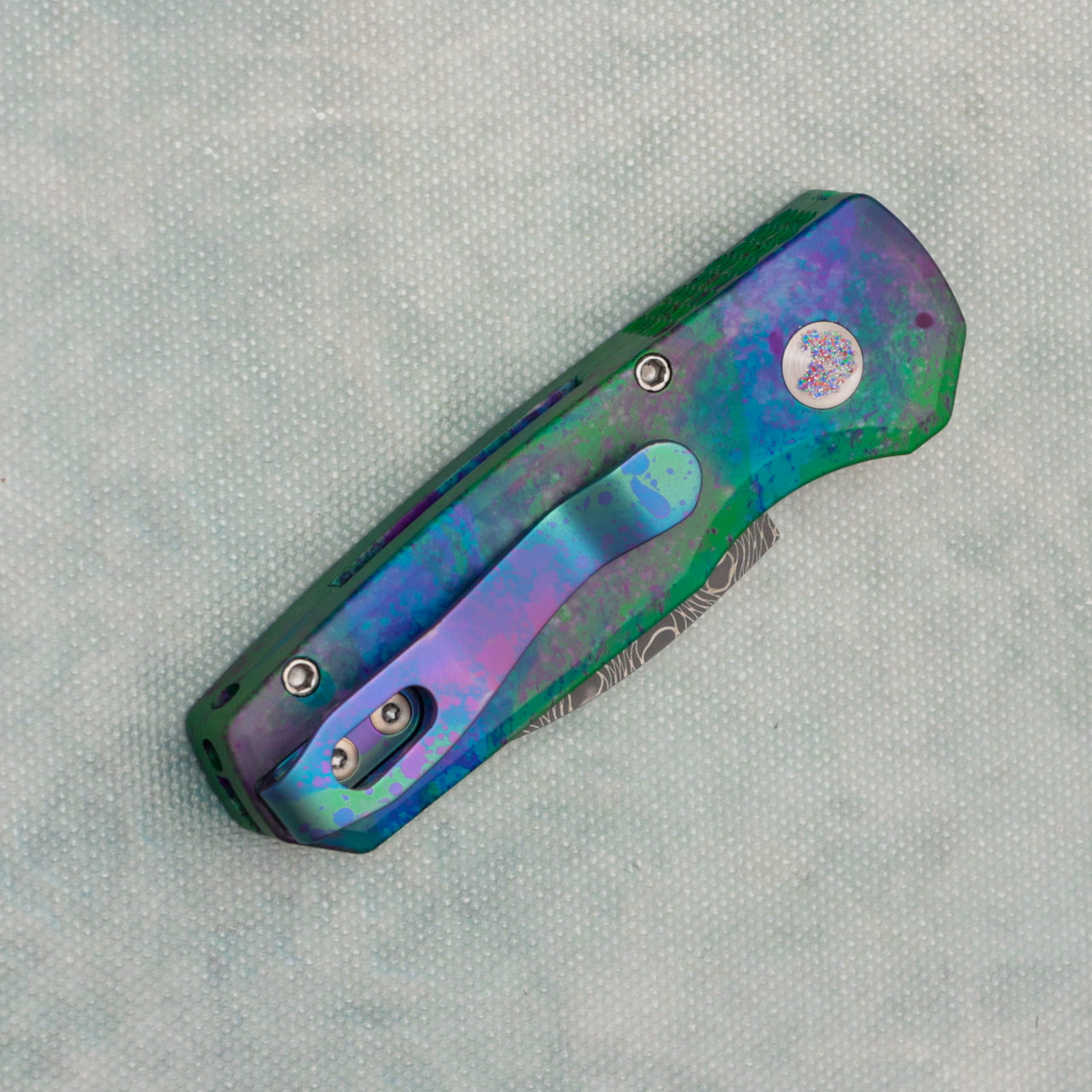 This model features a "Northern Lights" themed anodized 6061-T6 aluminum handle that is comprised of an array of the stunning blues, purples, and greens that are often displayed when the northern lights put on their show in the night sky. It has a Damascus wharncliffe blade from a different model and satin finished hardware with a Lynch northwest northern lights pocket clip for tip up carry. Pivot has some marks and back has some glitter on it, in a box for pt plus.