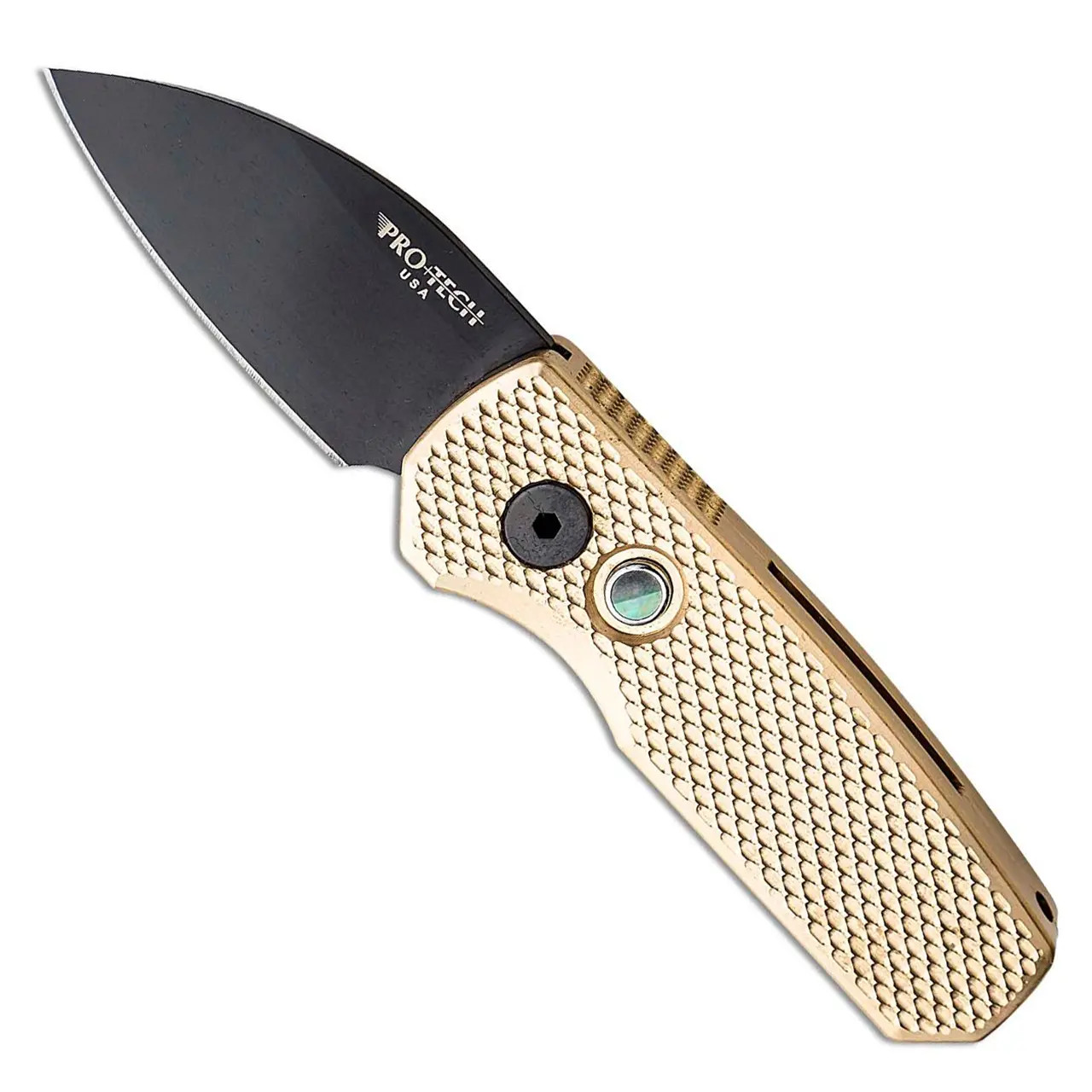 Pro-Tech Runt 5 Wharncliffe Textured Bronze AL Handle DLC 20CV Blade Pearl Button Limited Edition R5113