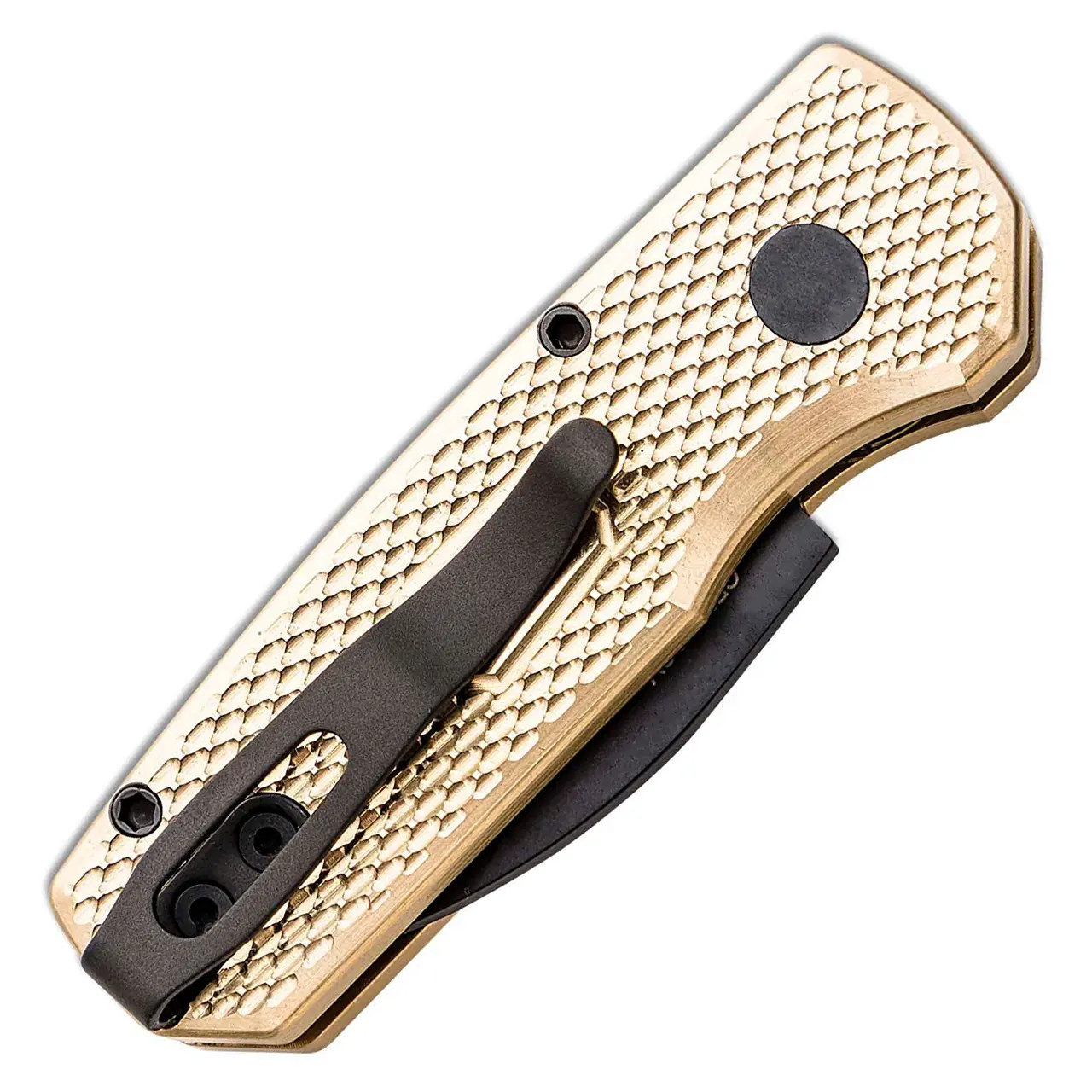 This limited edition model features stonewash finished textured Bronze AL handle scales. Black DLC finished CPM-20CV stainless steel wharncliffe blade. Black DLC finished hardware and pocket clip for tip up carry. Genuine mother of pearl inlaid push button. Brand new in box.