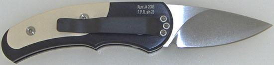 The Runt J4 has a satin finished 154-CM stainless steel California legal blade. The black anodized handles are milled from T-6061 aircraft aluminum and have ivory micarta inserts (front and back). Despite the knife's small size it feels very good in the hand (it feels much bigger than it is) and has superb action. It opens like a rocket and locks up solid. The Runt J4 also has a black coated pocket clip. Brand new in box.