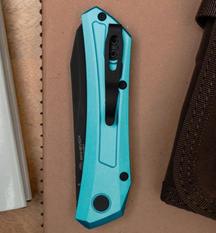 Dmitry Sinkevich is known for his remarkable designs, which are distinctively recognizable through their use of eccentric geometric lines & attention to detail. All of which can be easily seen in this latest auto. It features Tiffany blue aluminum handles, a black deep carry pocket clip and black hardware. DLC CPM-MagnaCut sheepsfoot blade. Brand new in box.