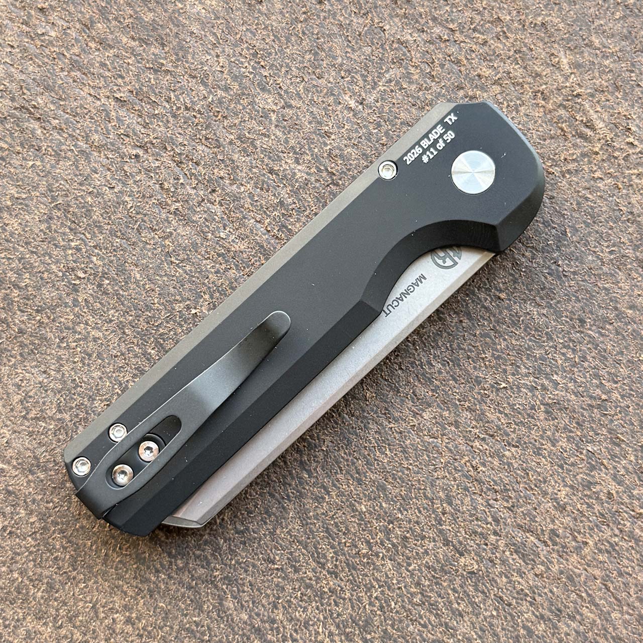 This model features a solid black 6061-T6 aluminum handle. Stonewash finished CPM-MagnaCut stainless steel sheepsfoot blade. Satin finished hardware and black deep carry pocket clip for tip up carry. Mosaic pin button. Numbered 11 of 50. Brand new in box.