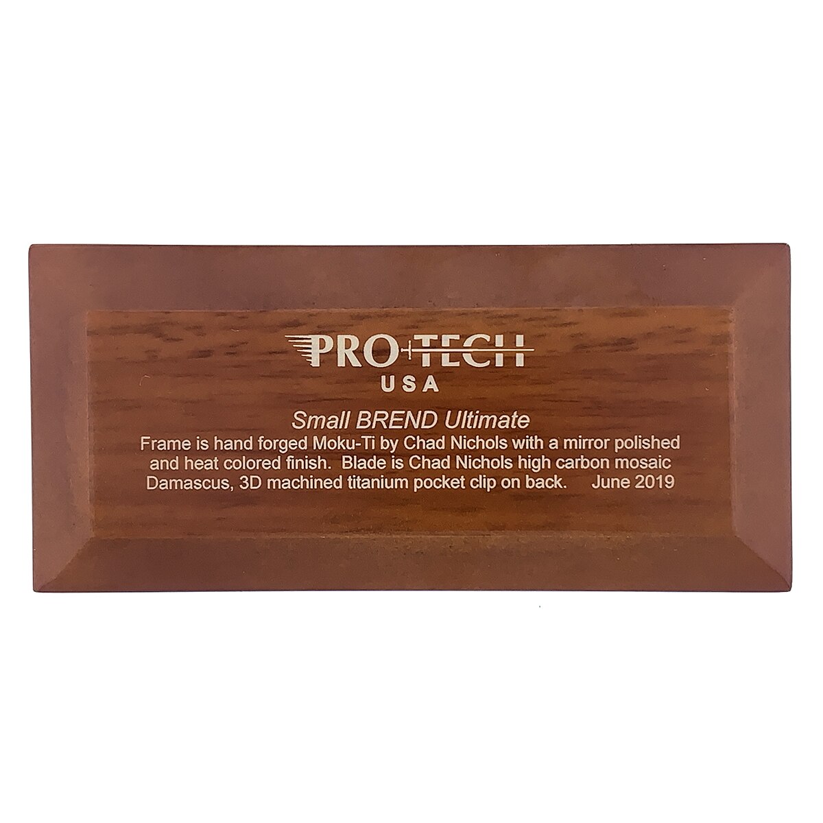 This custom model features a mirror polished and heat colored Chad Nichols Moku-Ti frame. The Pro-Tech logo is etched on the inner edge. Chad Nichols high carbon mosaic Damascus clip point blade. Matching blue anodized 3D machined titanium pocket clip. Fully engraved push button to add that finishing touch. A beautiful high class carry or collectors automatic pocket knife by Pro-Tech. Brand new in Pro-Tech wood presentation display box.