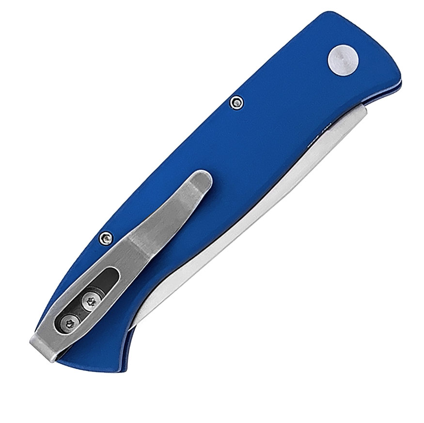 This model features solid blue anodized 6061-T6 aluminum handle scales. Satin finished 154-CM stainless steel clip point blade. Satin finished hardware. Polished stainless steel pocket clip. A great little EDC by Pro-Tech and Walter Brend. Brand new in box.