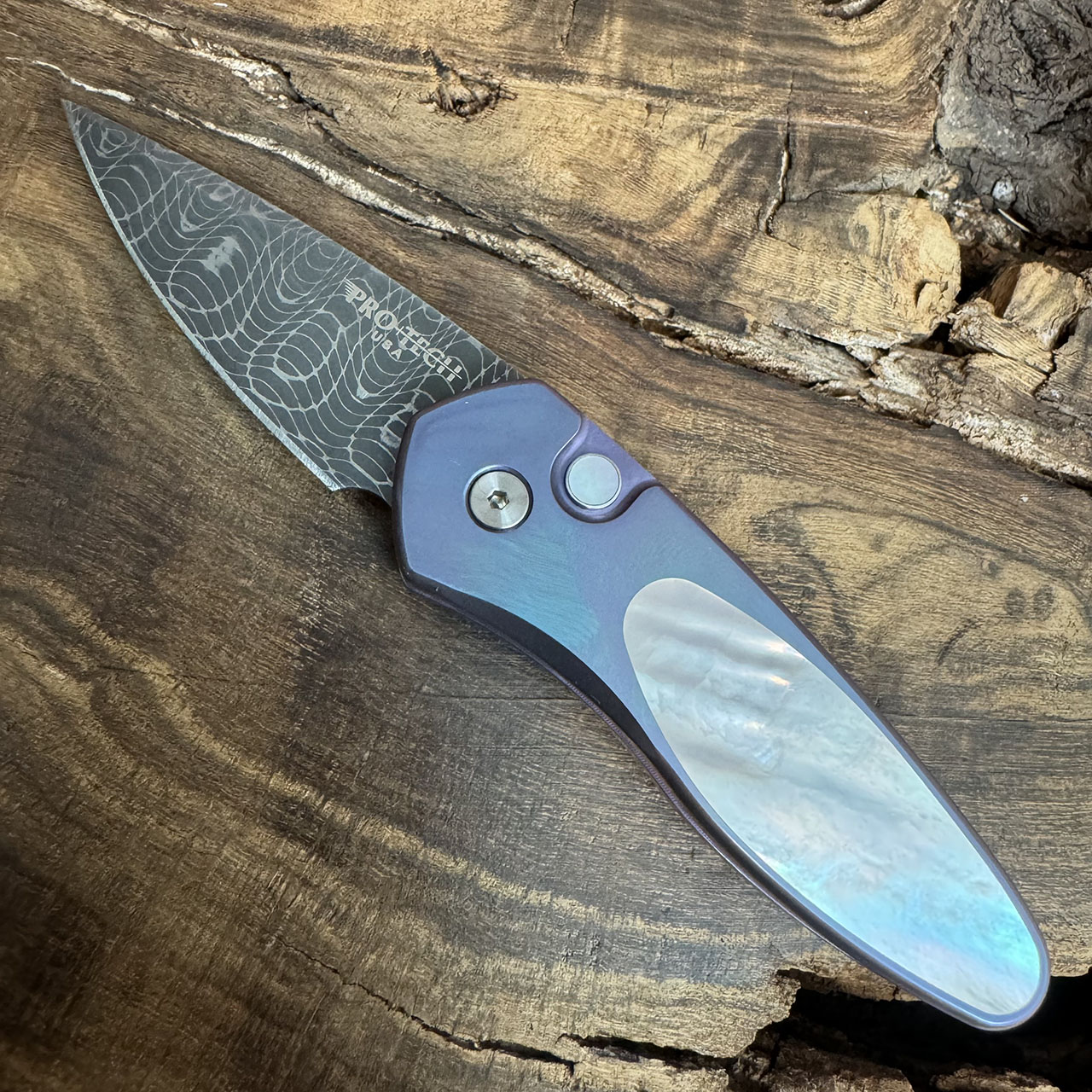 Pro-Tech Sprint Auto Custom Blue Titanium Handle w/ Pearl Inlay Handle Damascus Blade