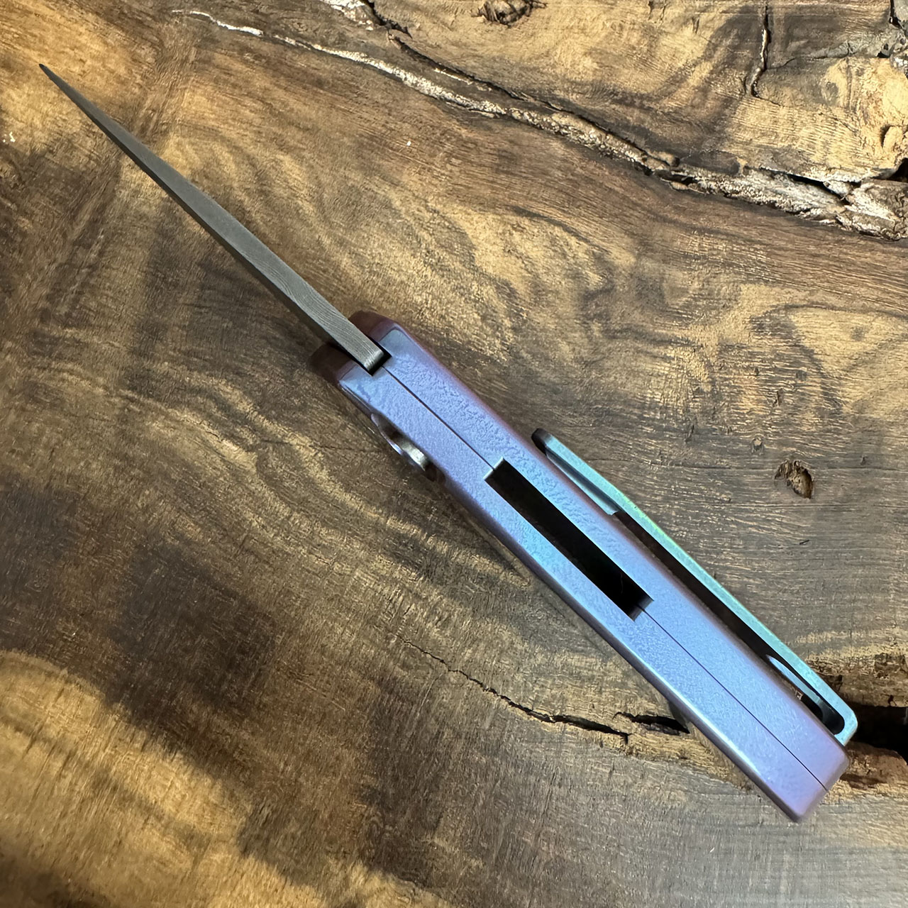 This custom model has blue anodized 6al4v titanium handle scales with a gorgeous pearl inlay on the front. Stainless Damascus spear point blade. Satin finished hardware. Matching pearl push button. Blue anodized 3D machined titanium deep carry pocket clip. Gorgeous custom iteration of the ProTech sprint! Brand new in box in Pro-Tech black presentation box.