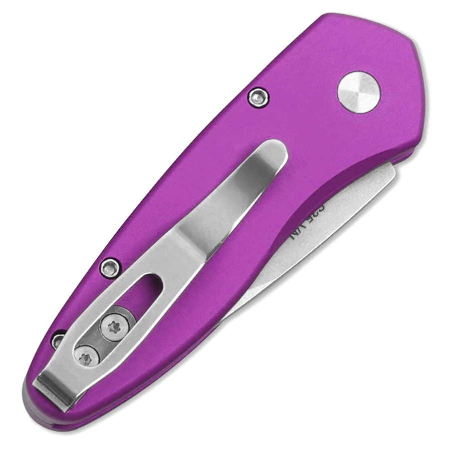 This model has solid purple anodized 6061-T6 aluminum handle scales. Stonewash finished CPM-S35VN stainless steel blade. Satin finished hardware and polished pocket clip. Brand new in box.