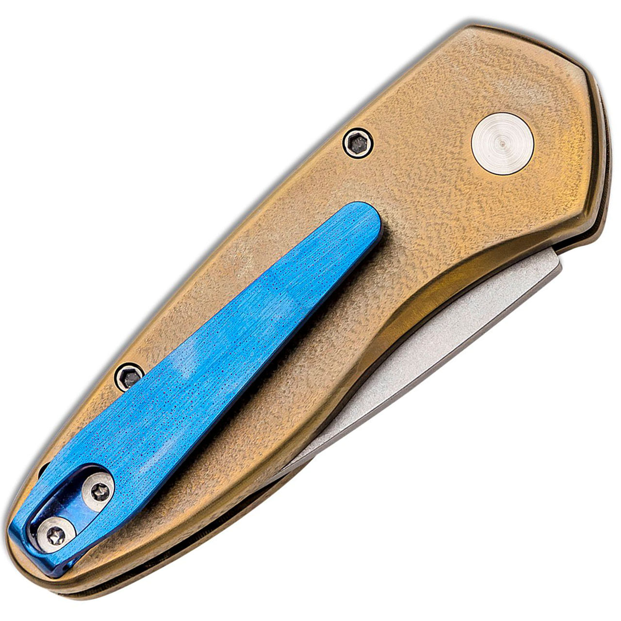 This custom model features bronze titanium handle scales with abalone inlay. Stonewashed S35VN stainless steel spear point blade. Satin finished hardware. Blue anodized machined titanium pocket clip. Abalone push button. Brand new in box.