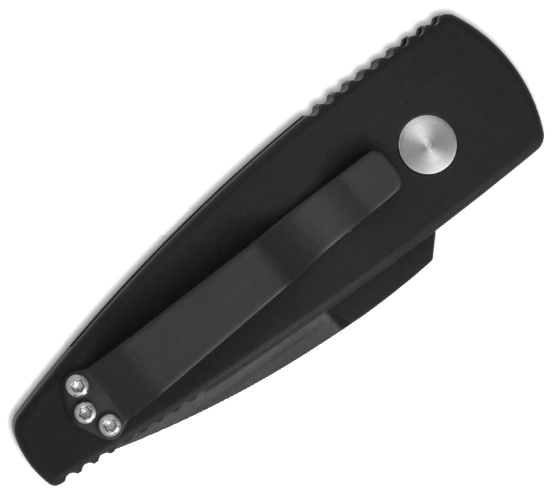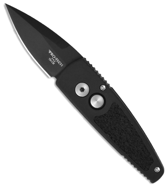 Proudly made in the USA, this Protech knife has black anodized aluminum handles with a black rubber non-slip inlay on the front. Black finished 154-CM stainless steel blade. False edge on top. This knife really hits hard. Removable pocket clip. California legal (just under 2 inch blade). Awesome custom Pro-Tech automatic pocket knife built to last a life time. New in box.