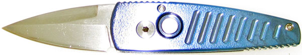 Proudly made in the USA, this Protech knife has solid blue anodized 6aI4v titanium handles with an orange peel finish. Mirror polished 154-CM stainless steel blade. False edge on top. Mother of pearl inlaid push button. This knife really hits hard. Removable pocket clip is high polished and say's PROTECH Limited Edition. California legal (just under 2 inch blade). Awesome custom Pro-Tech automatic pocket knife built to last a life time. New in box.