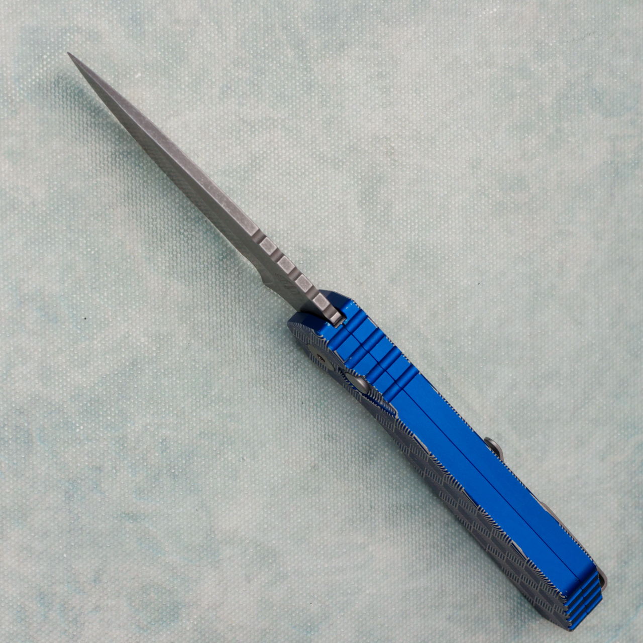 This model features 3d box lasered blue anodized aluminum handle scales. Acidwash finished CPM-Magnacut stainless steel drop point blade. The blade is marked with the ProTech and Strider logos. Bead blast finished hardware and tip up deep carry pocket clip. Pre-owned with a few light clip and handle marks, we lasered the scales, and acid washed the blade. No Box.