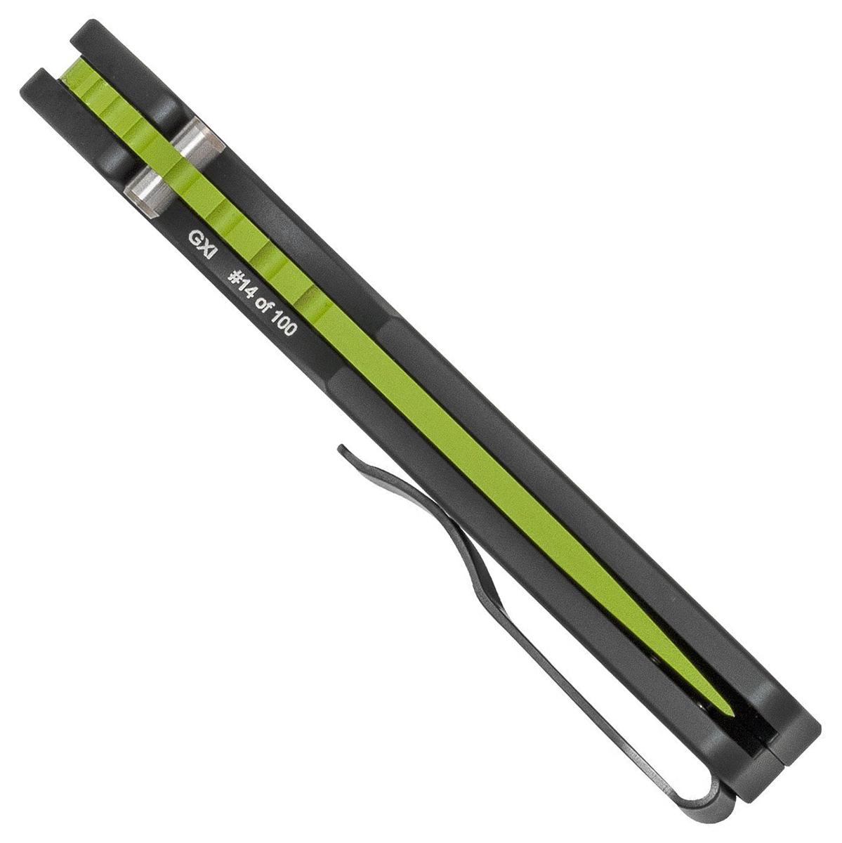 This custom limited edition model is from USN GXI and features solid black anodized 7075 aluminum handle scales. Two tone satin and neon green cerakote finished 154-CM stainless steel drop point blade. Satin finished hardware and black DLC finished tip up deep carry pocket clip. The edge of the frame is etched "GXI #XX of 100". Brand new in box.
