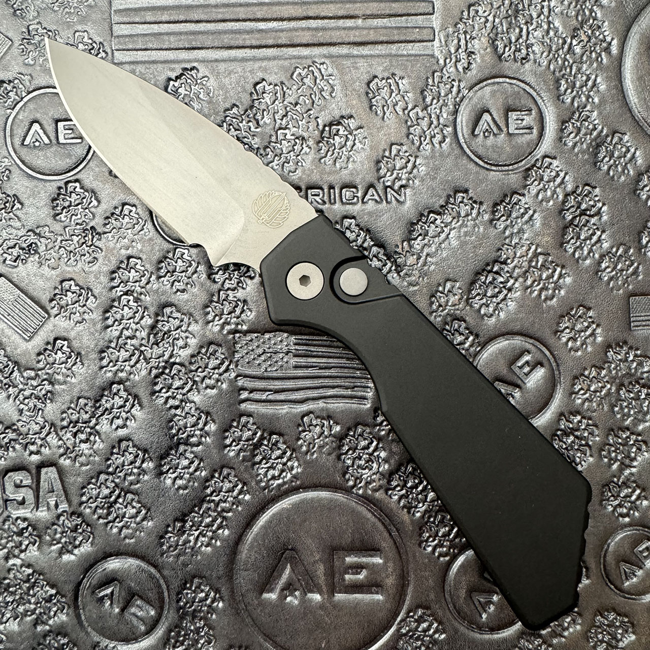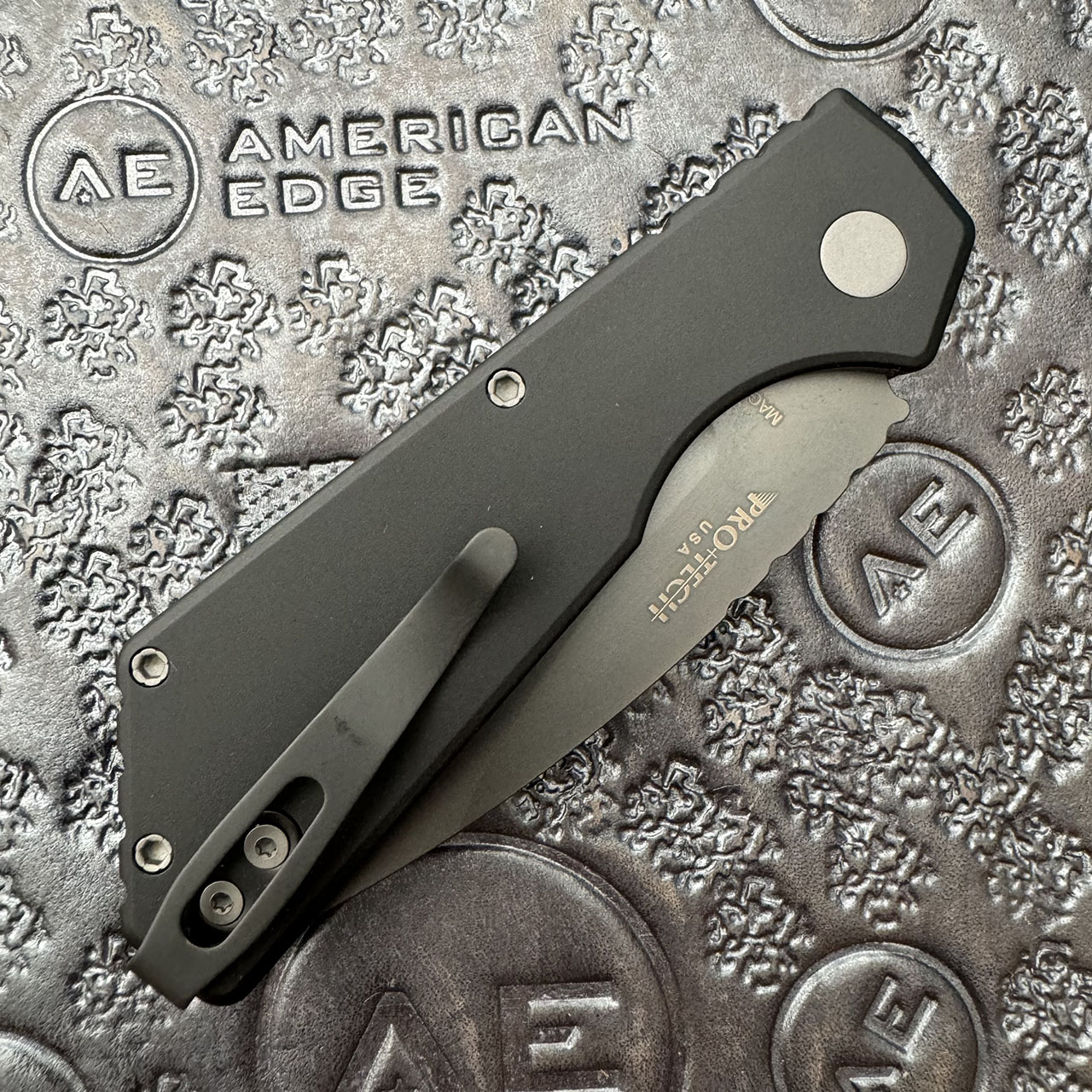 This model features solid black anodized 7075 aluminum handle scales. Smoky Grey DLC finished CPM-Magnacut stainless steel drop point blade. The blade is marked with the ProTech and Strider logos. Blasted finished hardware and a black DLC finished tip up deep carry pocket clip. Brand new in box.