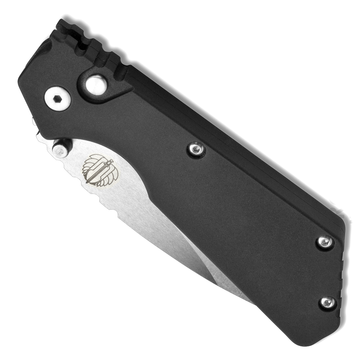 This model features solid black anodized 7075 aluminum handle scales. Stonewash finished 154-CM stainless steel drop point blade. The blade is marked with the Strider and ProTech logos. Satin finished hardware and a black DLC finished tip up deep carry pocket clip. Brand new in box.