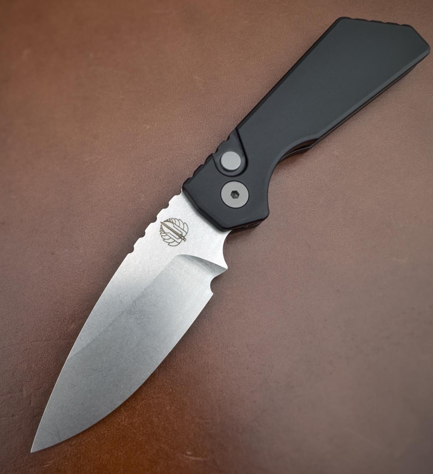 This model features solid black anodized 7075 aluminum handle scales. Stonewash finished CPM-Magnacut stainless steel drop point blade. The blade is marked with the ProTech and Strider logos. Bead blast finished hardware and a black DLC finished tip up deep carry pocket clip. Brand new in box.