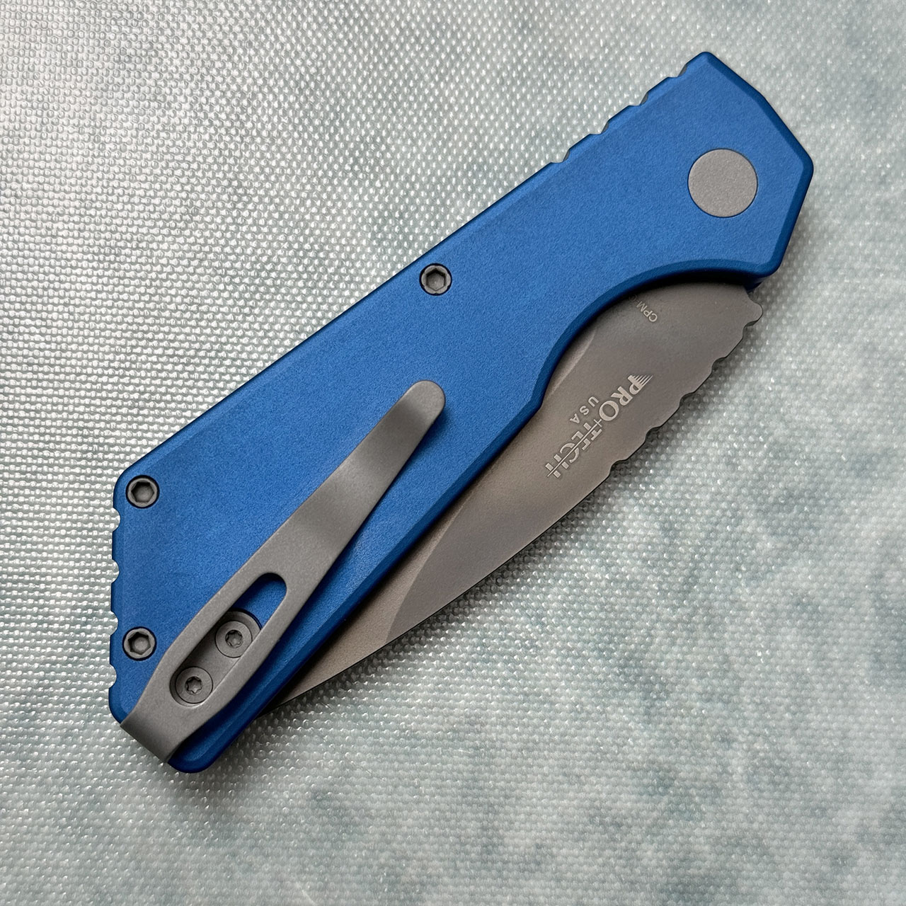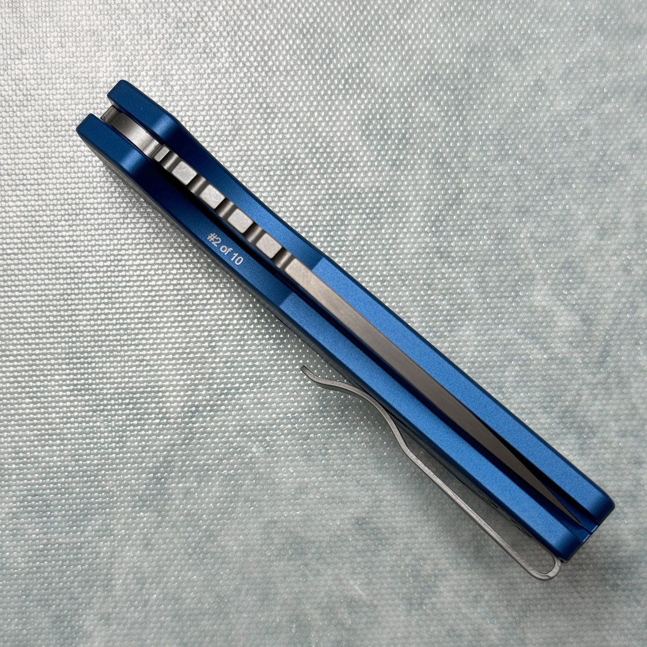 This Cancon model features solid blue anodized 7075 aluminum handle scales. Smoky Grey DLC finished CPM-Cruwear drop point blade. The blade is marked with the ProTech and Strider logos. Blasted finished hardware, orange G10 button and a blasted tip up deep carry pocket clip. Numbered xx of 10. Brand new in box.