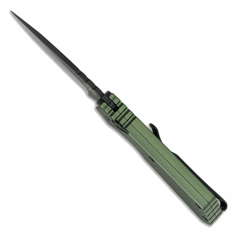 This model features solid dark green anodized 7075 aluminum handle scales. Black DLC finished 154-CM stainless steel drop point blade. All black hardware including a deep carry tip up pocket clip. Brand new in box.