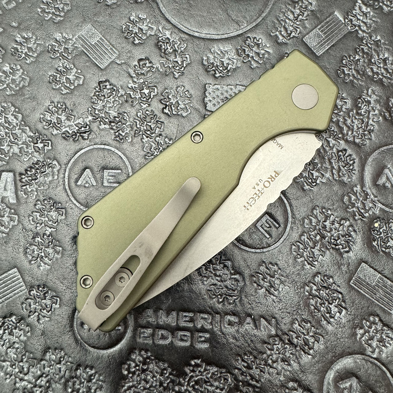 This model features solid green anodized 7075 aluminum handle scales. Stonewash finished CPM-Magnacut stainless steel drop point blade. The blade is marked with the ProTech and Strider logos. Bead blast finished hardware and tip up deep carry pocket clip. Brand new in box.