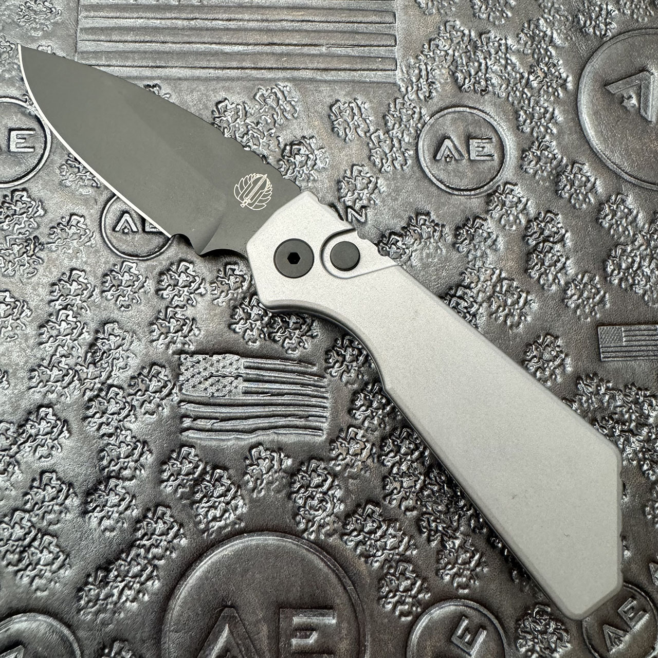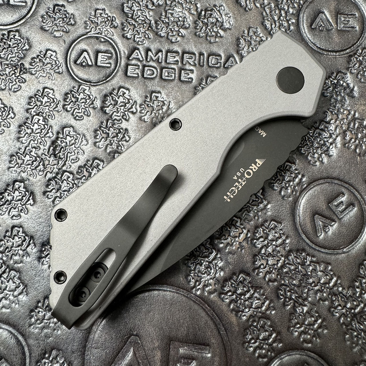 This model features solid grey anodized 7075 aluminum handle scales. Black DLC finished CPM-Magnacut stainless steel drop point blade. The blade is marked with the ProTech and Strider logos. Black finished hardware and a black DLC finished tip up deep carry pocket clip. Brand new in box.