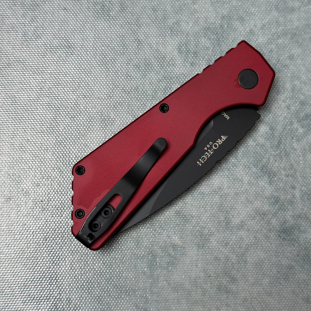This model features solid red anodized 7075 aluminum handle scales. Black DLC finished CPM-Magnacut stainless steel drop point blade. The blade is marked with the ProTech and Strider logos. Black finished hardware and a black DLC finished tip up deep carry pocket clip. Brand new in box.