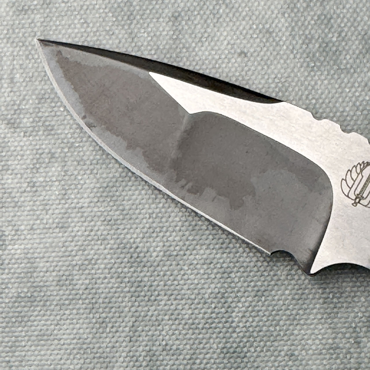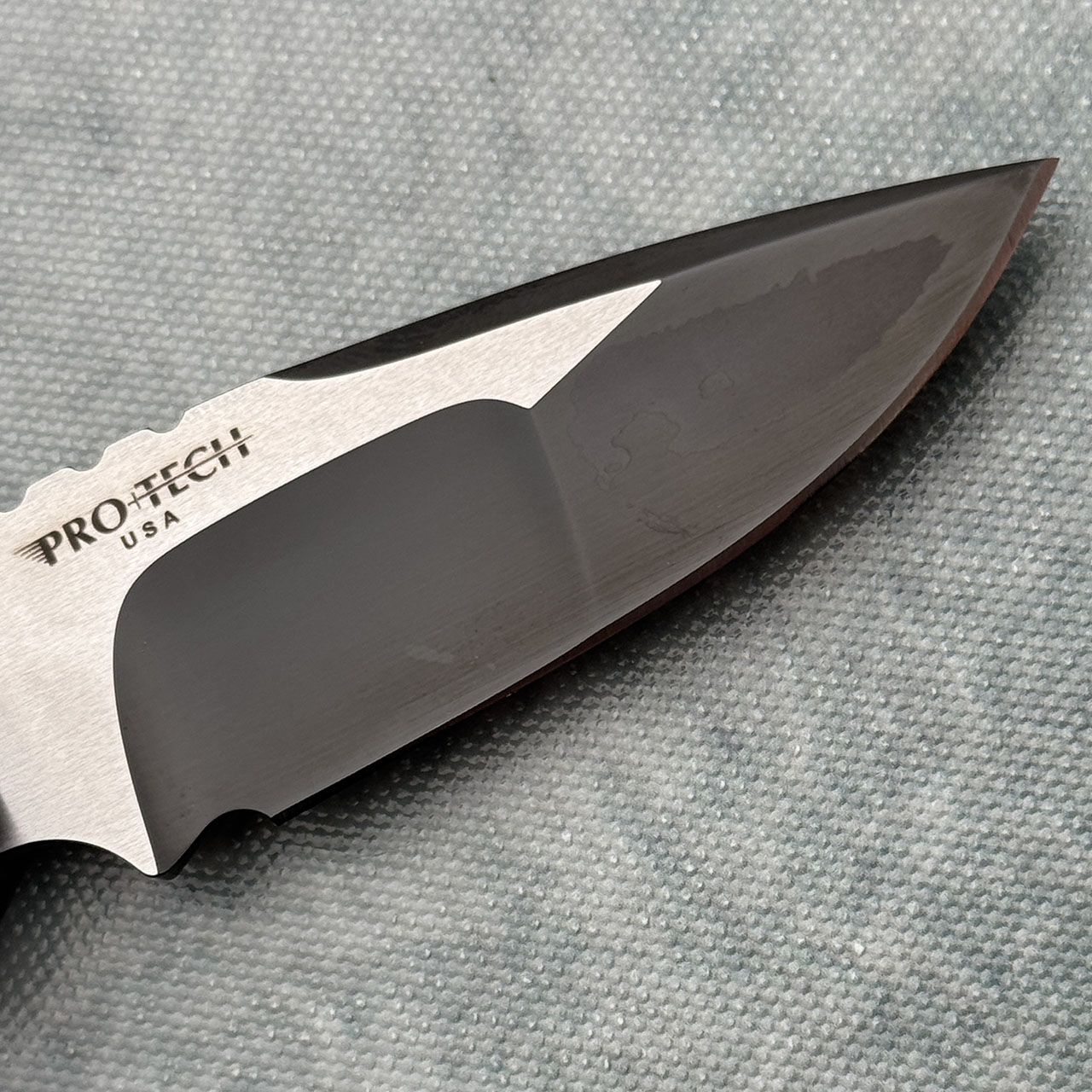 This model features gridlock textured 17-4 stainless steel handle scales. 2-tone DLC/Satin finished Mike Irie hand ground drop point blade. The blade is marked with the ProTech and Strider logos. Satin finished hardware, pearl button and a black tip up deep carry pocket clip. Brand new in box, but this is a blemish model with the DLC on the blade having inconsistencies and the texture on scale by the clip not being full. *BLEMS are not avaialble for warranty for the blem.